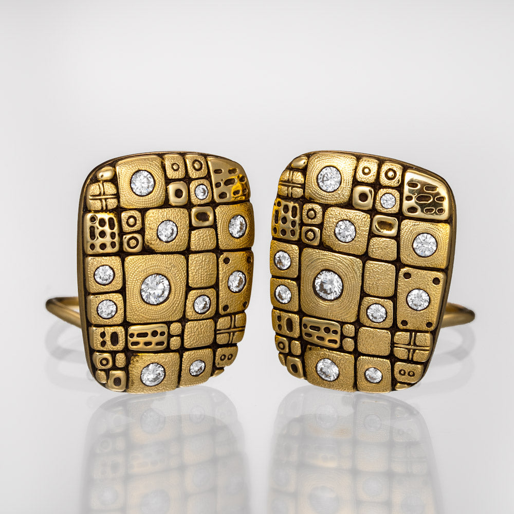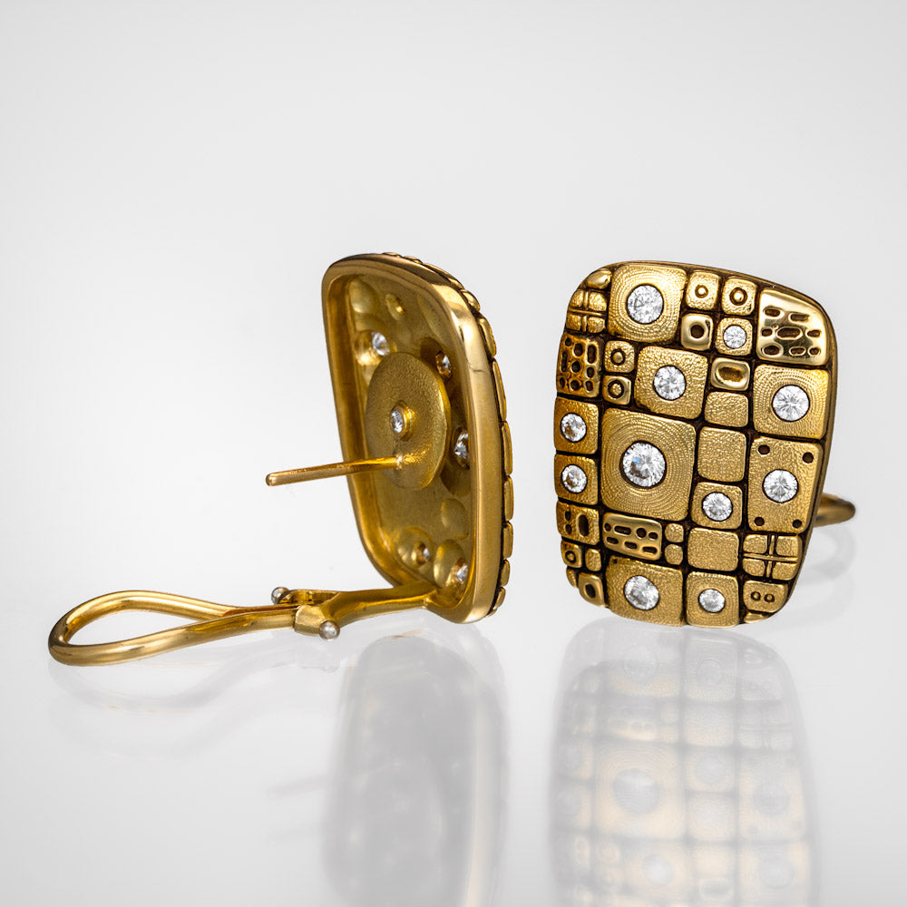Regular price $15,270.00 Save $-15,270.00Pathway Earrings in 18kt Yellow Gold - White Diamond - Tapered rectangle shape with round and square textured accents - There are 22 flush set white diamonds totaling 0.67ct - All diamonds have a color grade of F-G and clarity of VVS - Post and hinged omega Clip backing - Hand Hammered and Textured - Oxidized