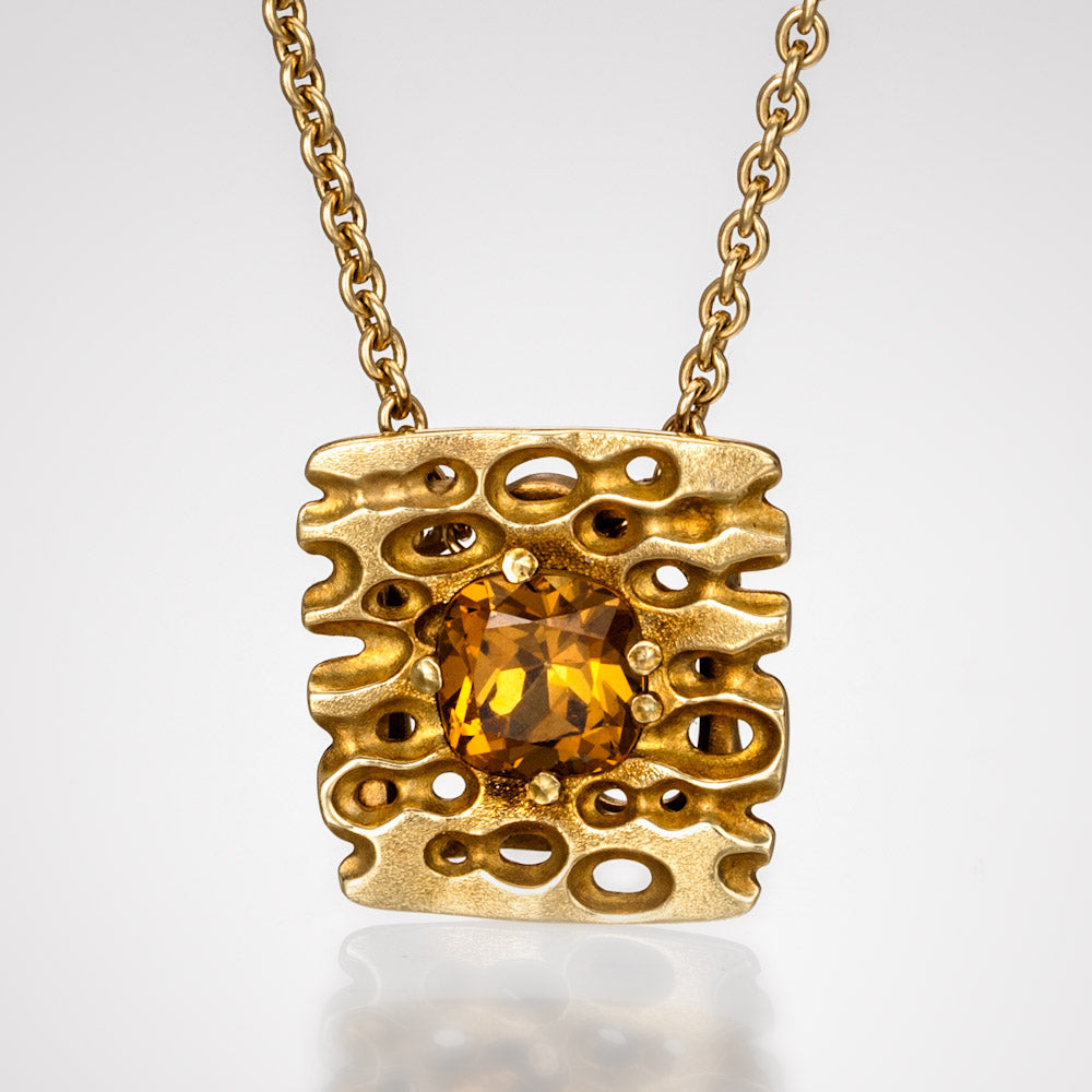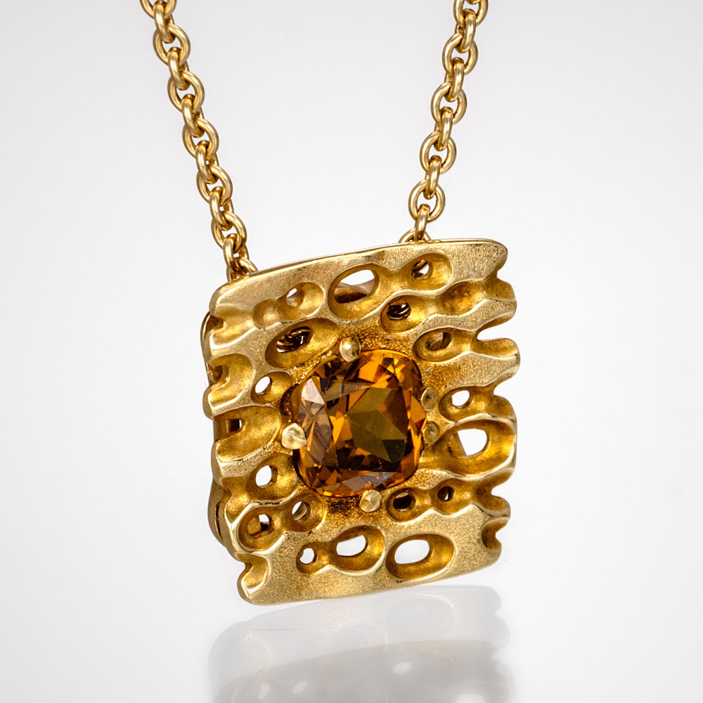 Regular price $8,130.00 Save $-8,130.00Square Characters Pendant in 18kt Yellow Gold - Mali Garnet - Rustic square design with one cushion cut Mali garnet at the center - The Mali Garnet measures 14mm by 14mm - Hand Hammered and Textured - Oxidized