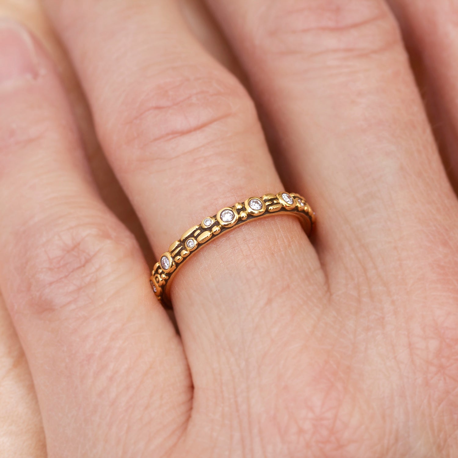 Circle Ring in 18kt Yellow Gold - White Diamonds - Simple narrow band with 12-13 round white bezel set diamonds with a total weight of approximately 0.16CT - Number of diamonds and diamond carat weight is dependent upon the diamond configuration in the band - All white diamonds have a color grade of F-G and clarity of VVS - Hand Hammered and Textured - Oxidized - This ring measures 2.5mm tall by 1.5mm deep