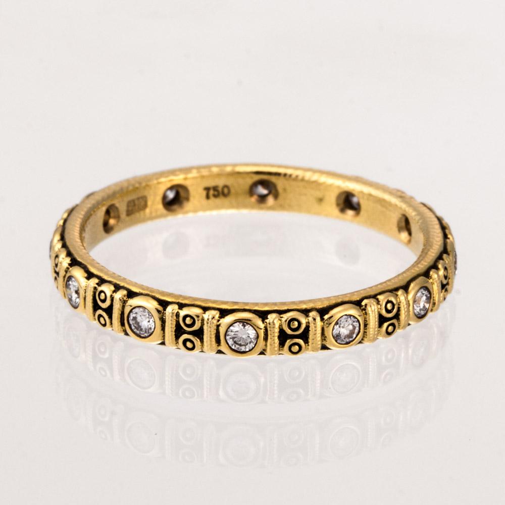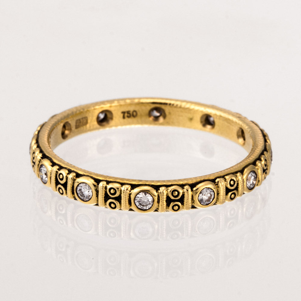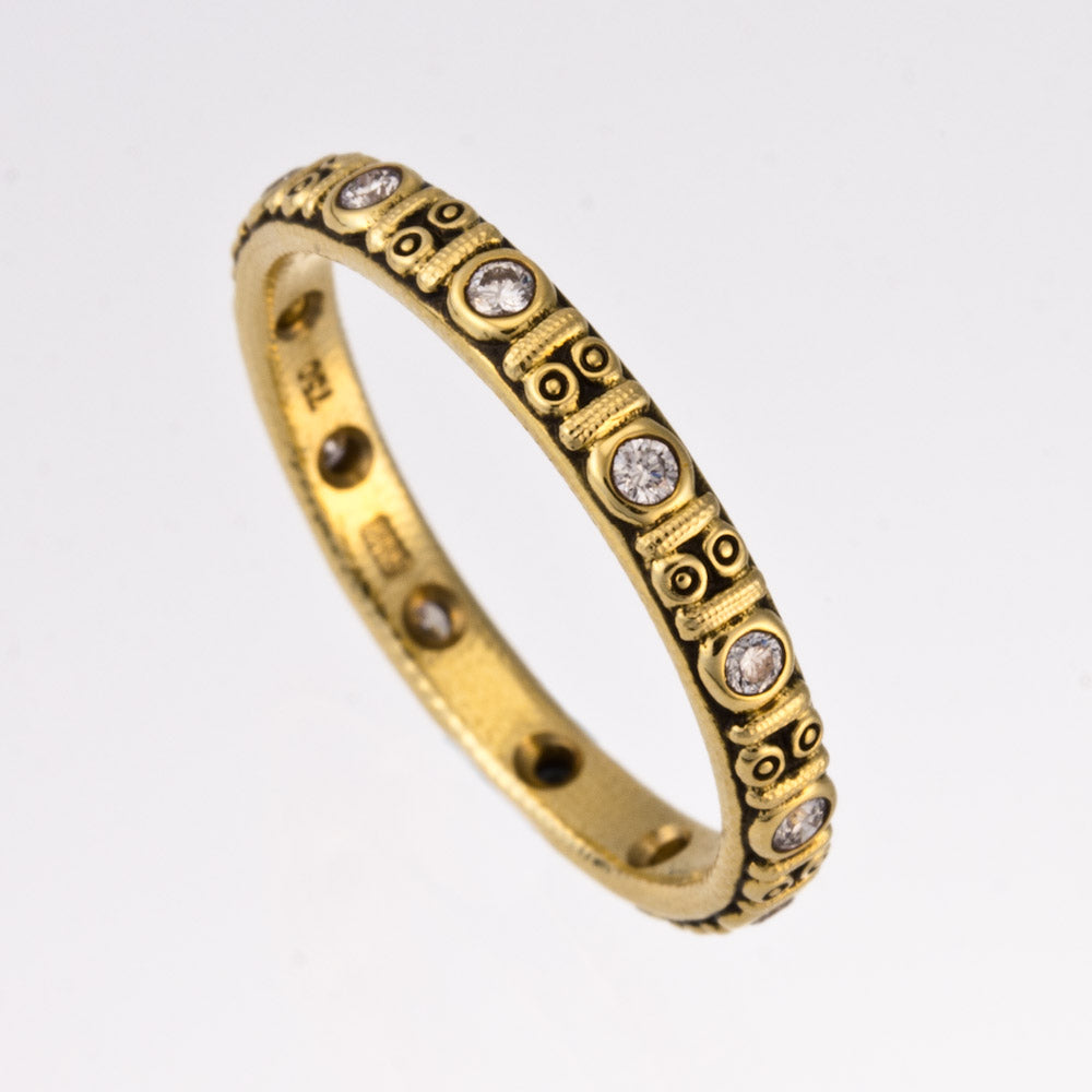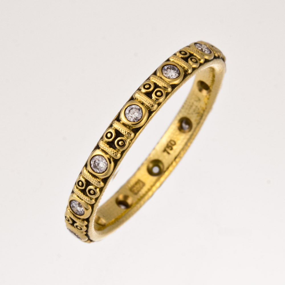 Regular price $4,725.00 Save $-4,725.00View miniature sculptures in a roundabout way with this Circle ring. Alex Šepkus is a direct designer. He rarely uses a design or sketch. He will take the engraver and start at one end and go to the other end and he will design as he goes and carve the whole ring right there, which is very rare. He is so precise that his hand hammered finishes are completed under magnification with tools that he created himself. This band is gorgeous by itself or perfect to accentuate an engagement ring or even stack it with other Alex Šepkus bands to create a very individual look. This 18k oxidized yellow gold band is 2.5 mm wide with bezel set white diamonds.