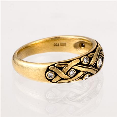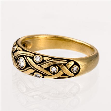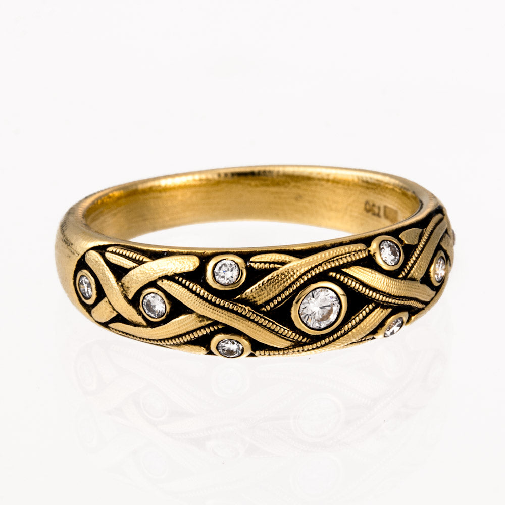 Vine Dome Band in 18kt Yellow Gold White Diamonds - Crisscross design at the top of the band with diamonds of varying size set through the latticework - The 9 round white bezel set diamonds have a carat weight of 0.14ct and measure between 1mm and 2mm in diameter - All white diamonds have a color grade of F-G and clarity of VVS - Hand Hammered and Textured - Oxidized - This ring measures 6mm tall by 3mm deep at the top and tapers down to 3mm wide by 1.5mm deep at that back of the finger.