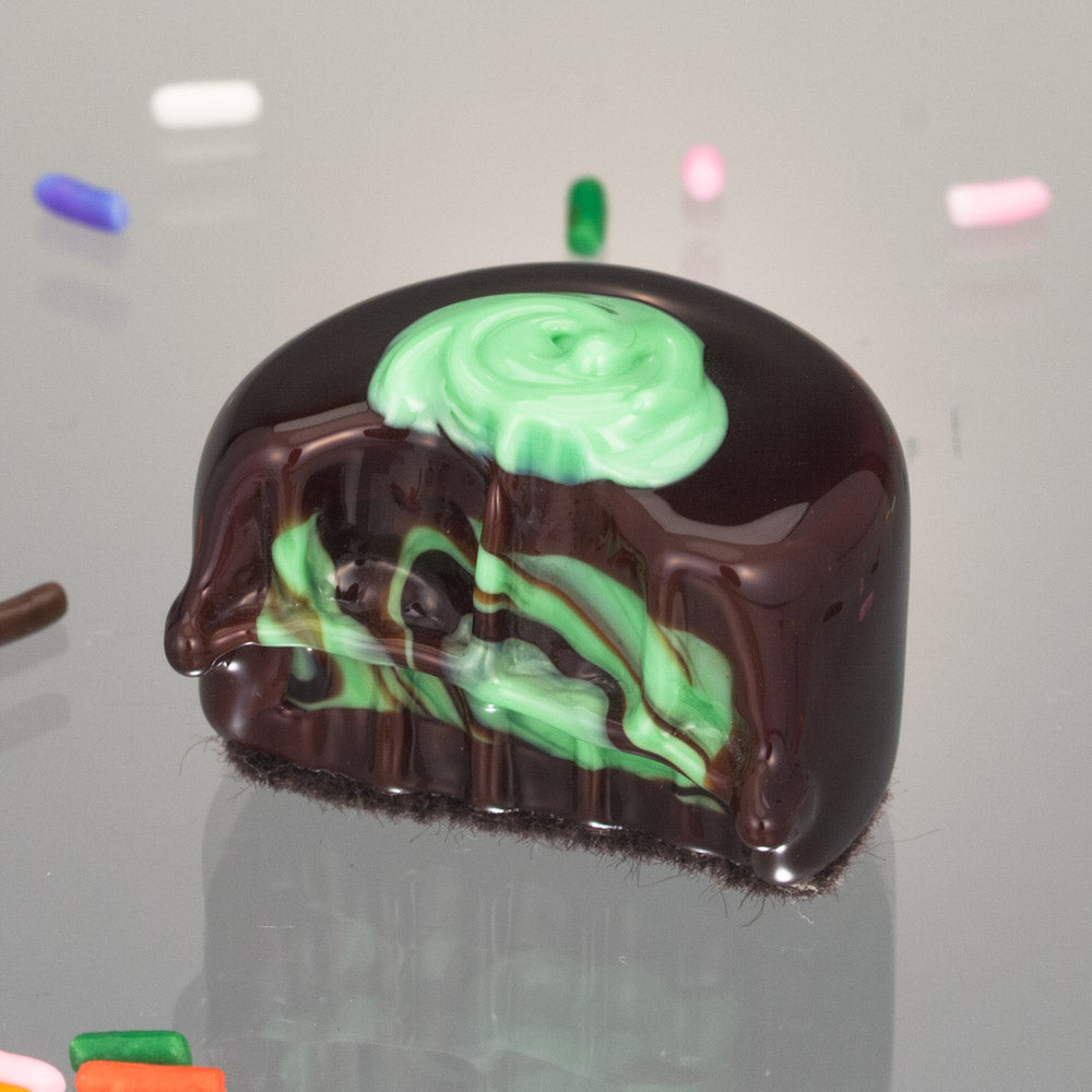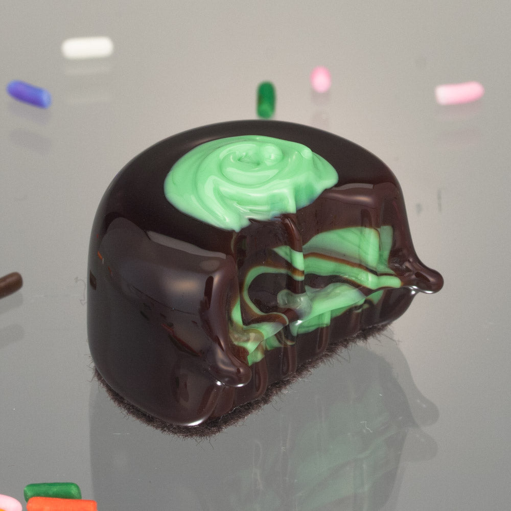Poetry in chocolate! Designed to bring a smile to your lips, without the calories or cavities! An exquisite chocolate candy bite, topped with mouthwateringly realistic mint green swirl. This solid handcrafted glass sculpture by Hulet Glass is so fun to collect and display! Each unique glass candy is individually signed, dated, mounted on a felt pad and nestled in its own paper cup and dainty box.