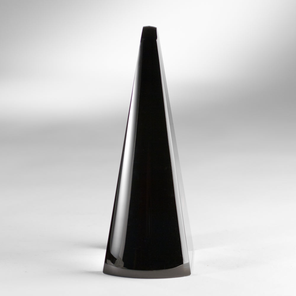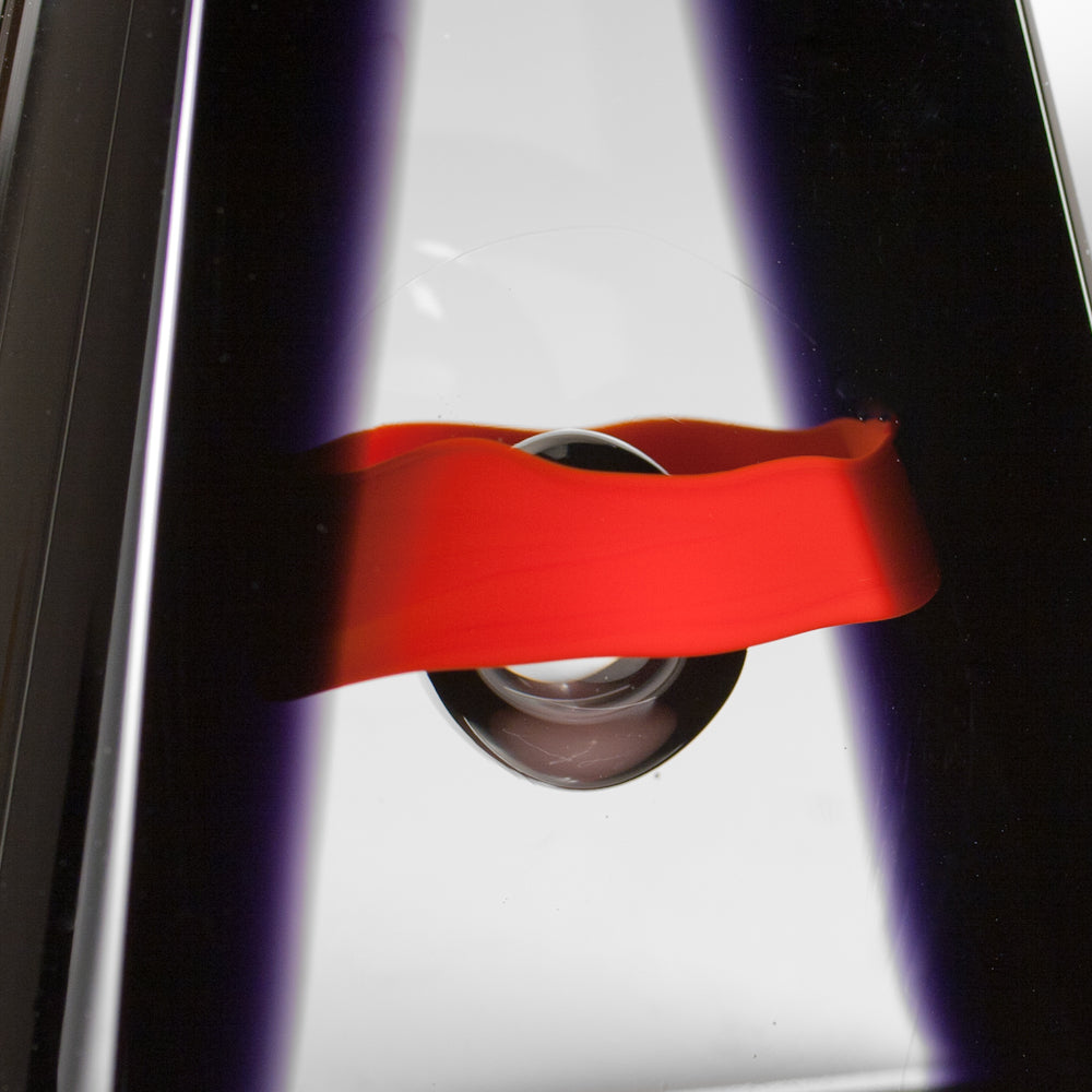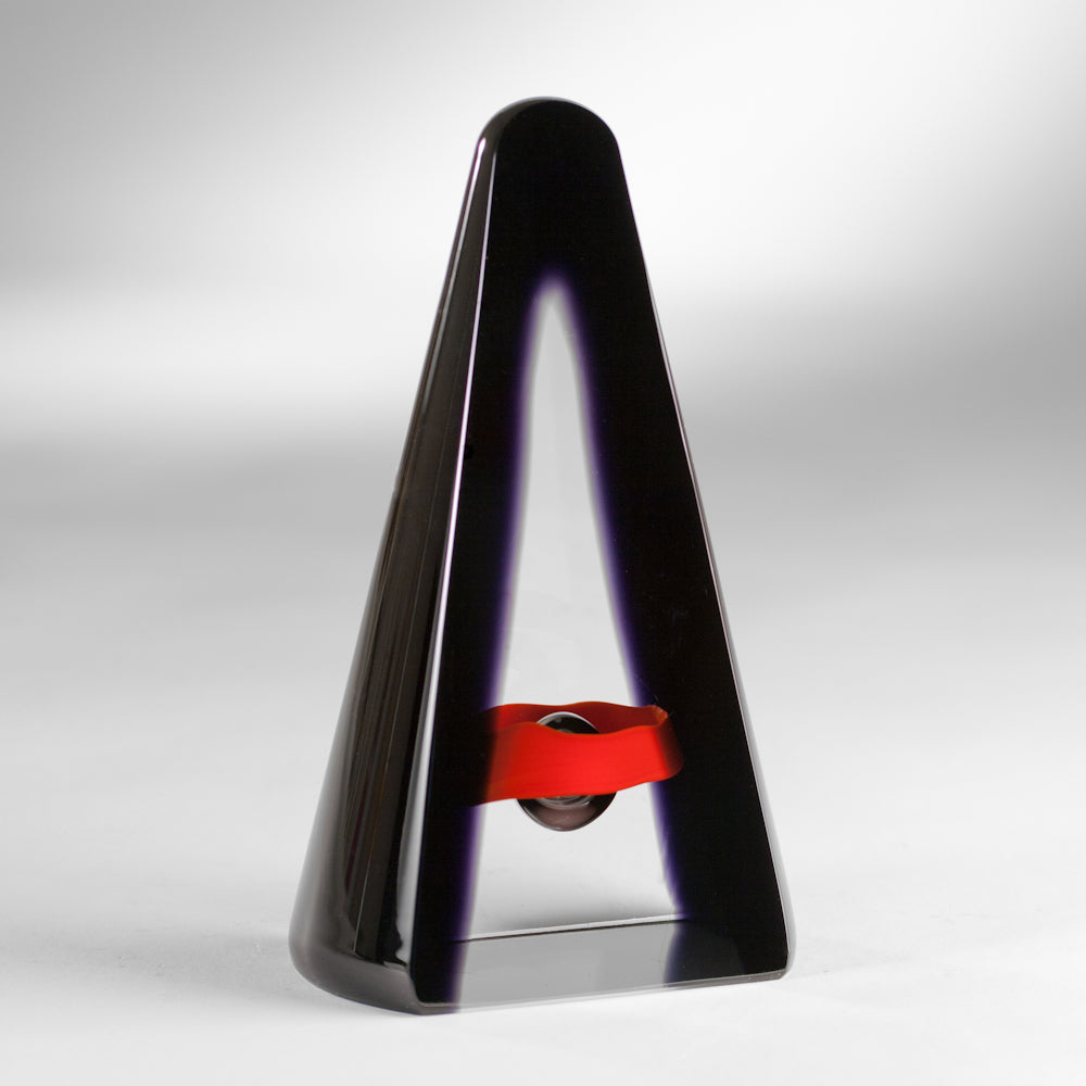 Regular price $395.00 Save $-395.00Blissful evening. Modern, abstract, powerful. Night is falling on this single bubble encircled by a brilliant sunset ribbon of red. Like an inverted letter "V,” the edges of NIGHTFALL are curved with a deep, glowing black. The front and back are cut flat with a rounded point at the top. This contemporary art glass object is hand-blown, cut and polished.