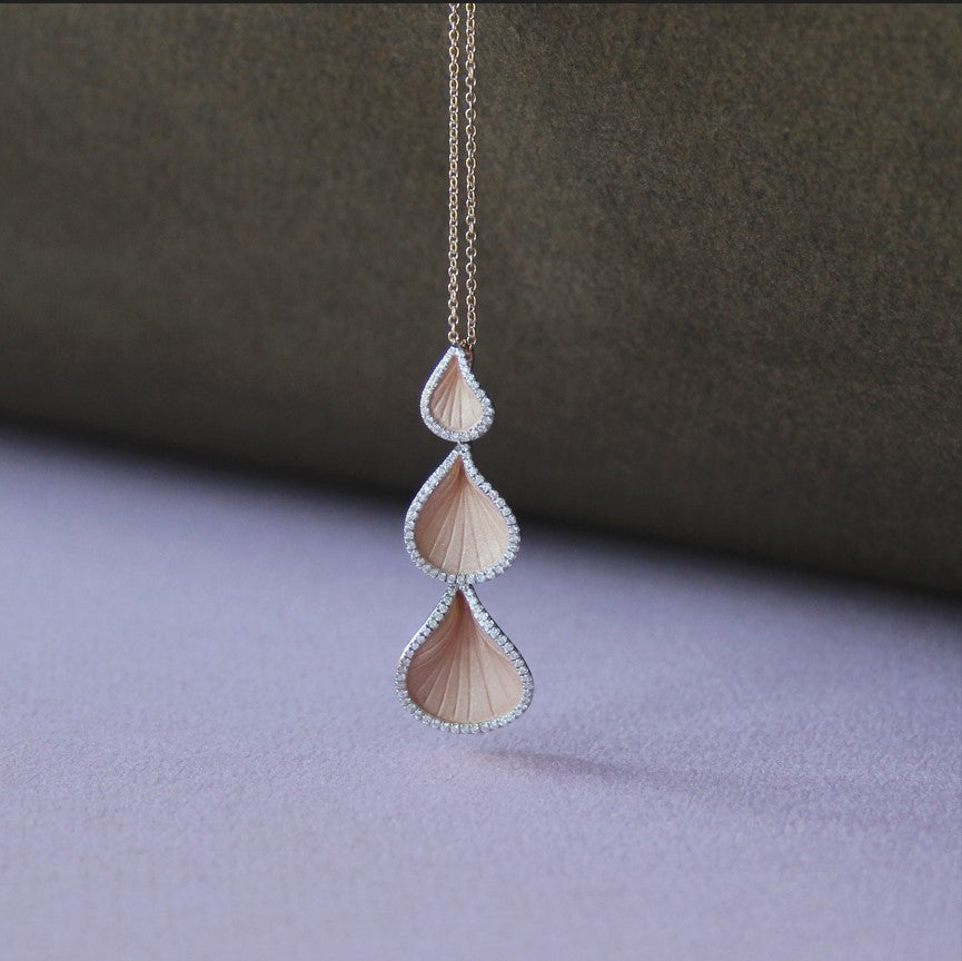 Regular price $6,525.00 Save $-6,525.00Necklace - Pendant Style - Goccia Pendant - White Diamonds - 18kt Gold - Three teardrop shaped gold petals - Sandblasted finish with polished edges - Edges are outlined with 0.28cttw bead set diamonds - 17.5 inch 18kt Gold cable link chain with lobster clasp can also be worn at 16.5" - Pendant measures 41 millimeters diameter long, 15 millimeters wide and 6 millimeters deep.
