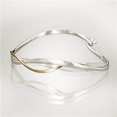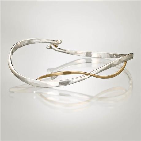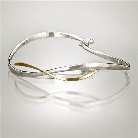 Two Tone Ribbon Bracelet in Argentium Silver and 14kt Yellow Gold - No Gemstone - Thin bangle style bracelet in polished silver has a slight cascade at the top of the wrist over which is a 14KTYG ribbon cascading in the opposite direction creating a design reminiscent of the figure eight - Hook Clasp - Hand Forged
