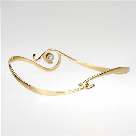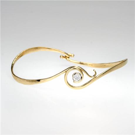 Twining Spiral Bracelet in 14kt Yellow Gold - Diamond - Bangle style thin wire bracelet with an open spiral at the top - There is a single diamond set in the center of the open spiral - Single diamond is bezel set and weighs .25CT - Hook Clasp - Hand Forged