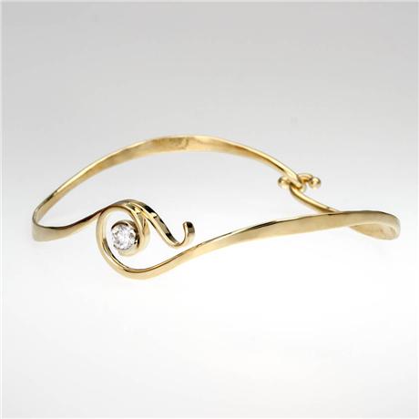 Twisting and TWINING with captivating curves. Alluring, feminine and graceful, the TWINING bracelet created by Tom Kruskal contains a single diamond within a swirl of hand forged 14k yellow gold. The ancient technique of hand forging makes the gold stronger, and with all of Tom's attention to detail this gold shimmers brightly from all of his hand work. The TWINING bracelet secures with a hook clasp. This bangle bracelet emphasizes the beauty of the diamond and sits comfortably the wrist.