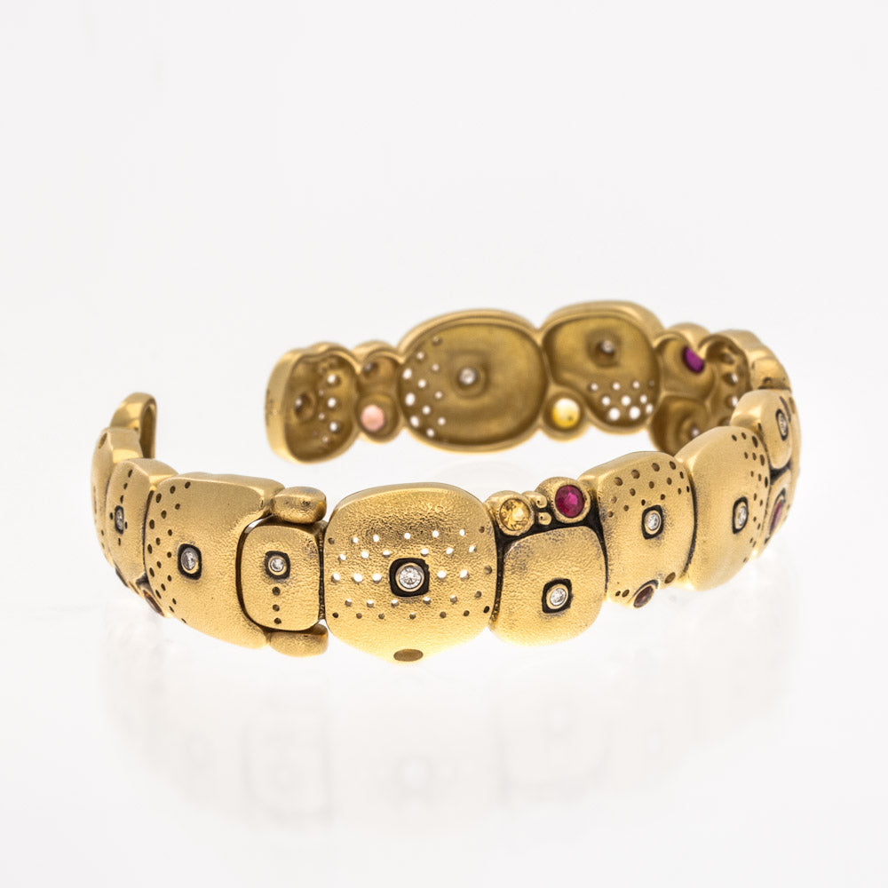 Regular price $35,305.00 Save $-35,305.00Orchard Bracelet in 18kt Yellow Gold - Sapphire and Diamond - Textured and pierced square designs with rounded corners in varying sizes with diamonds set at the center of each square - Scattered throughout the design are 14 bezel set sapphires varying in color and size with a total carat weight of approximately 1.19cts - The sapphire colors in this bracelet are an Orange, Pink and Yellow in a mixture of color intensities - Hand Hammered - All cuffs have a hinged back to allow for easy on and off - There are a total of 17 white diamonds that equal 0.21 carat total weight with a color grade of F-G and clarity of VVS - This cuff measurements are coming soon