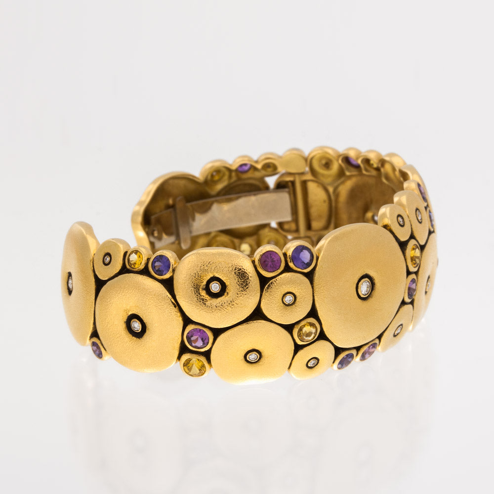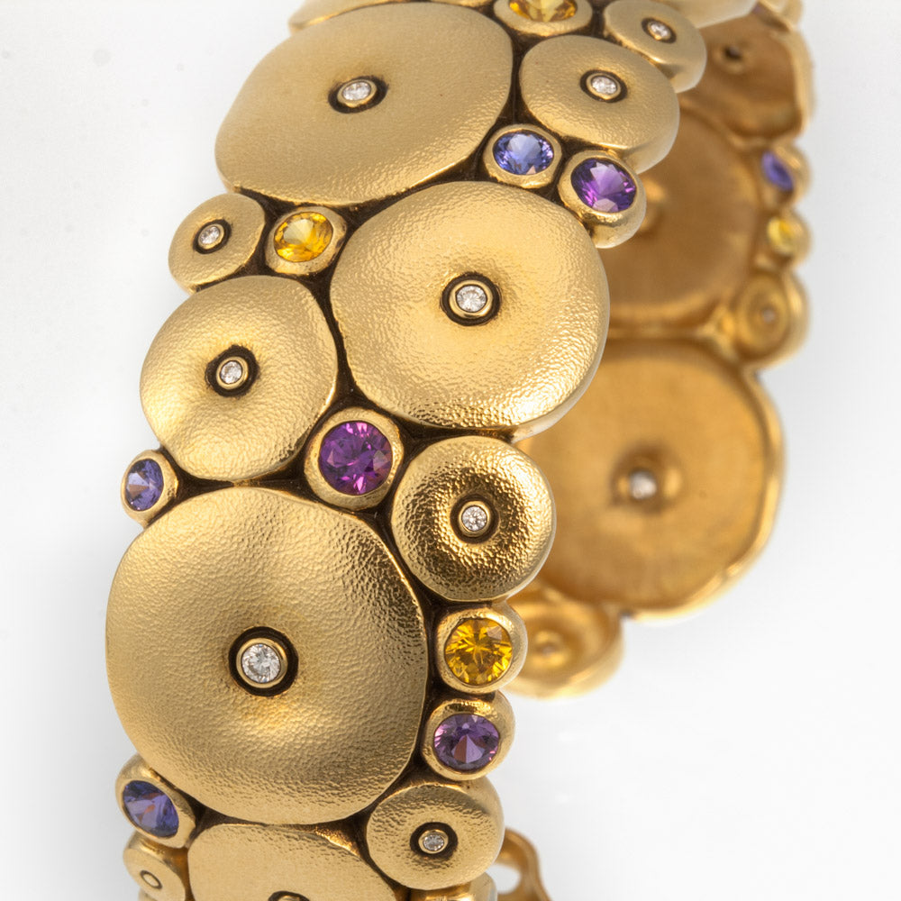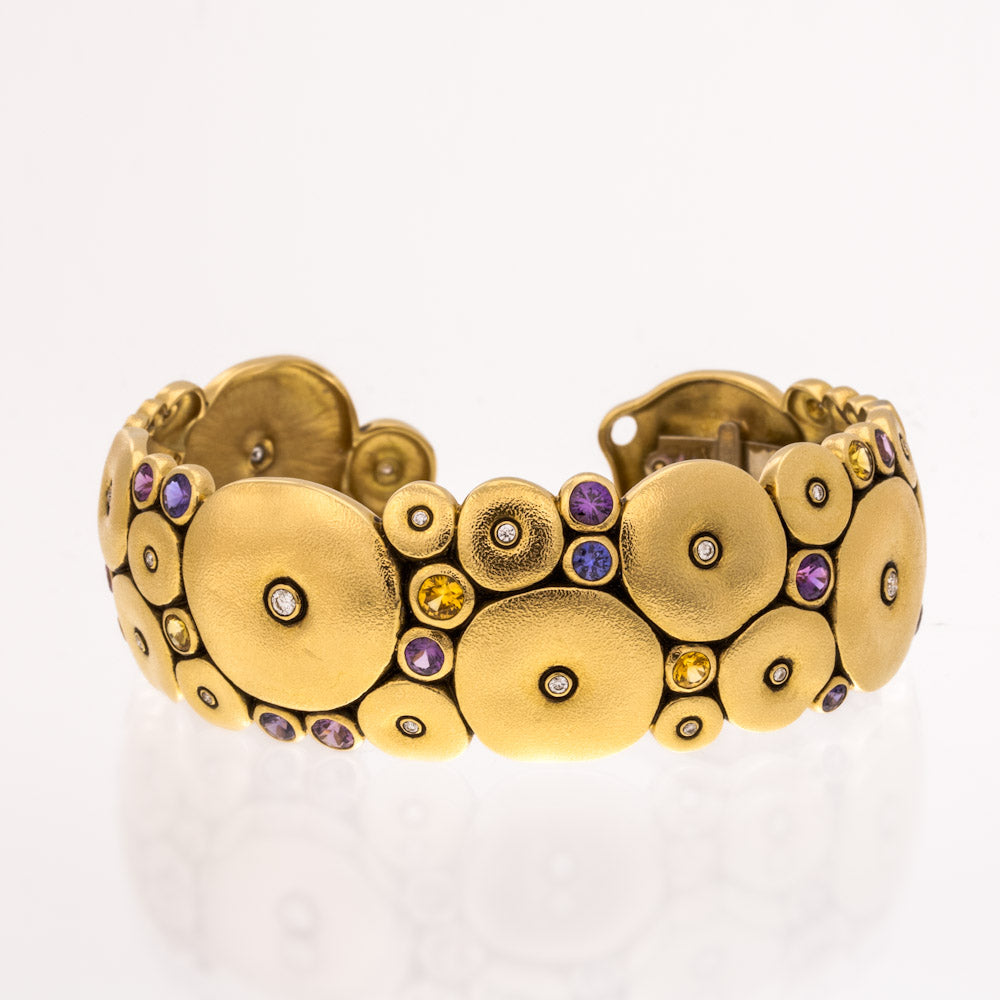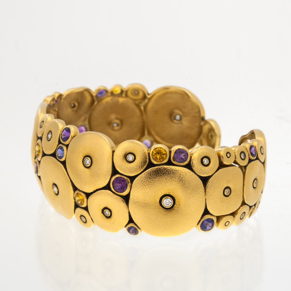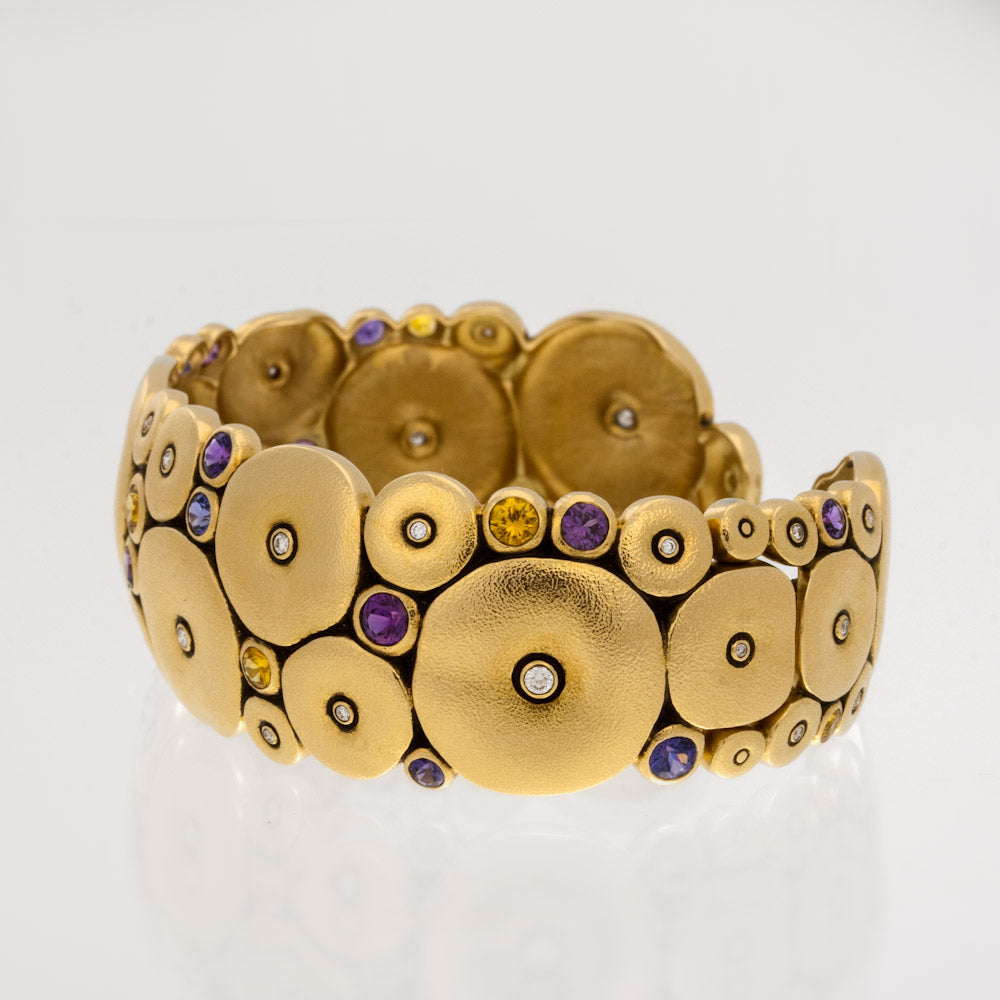 Orchard Bracelet in 18kt Yellow Gold - Sapphire and White Diamond - Textured circle designs in varying sizes with diamonds set at the center of each circle - Scattered throughout the design are bezel set sapphires varying in color and size - The sapphire colors in this bracelet are Blue, Orange and Purple in a medium rich tone palette - Hand Hammered - All cuffs have a hinged back to allow for easy on and off - There are a total of 26 white diamonds that equal 0.30 carat total weight with a color grade of F-G and clarity of VVS - There are 22 sapphires with a 4.44 carat total weight - This Cuff measures 7 inches around measured inside the cuff by 21.5mm wide by 4.5mm deep - The cuff opening, when open, is 1.5 inches.