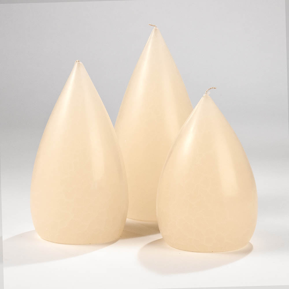 Regular price $105.00 Save $-105.00While contemporary in nature, the simplicity of this set of three short ivory free form rounded tapered candles lends them to both modern and traditional settings. They stand up to relatively high temperatures without slumping and burn cleanly. Made using a blend of very high-grade paraffin waxes. The wicks are cotton and natural fibers without any metal. Unscented.