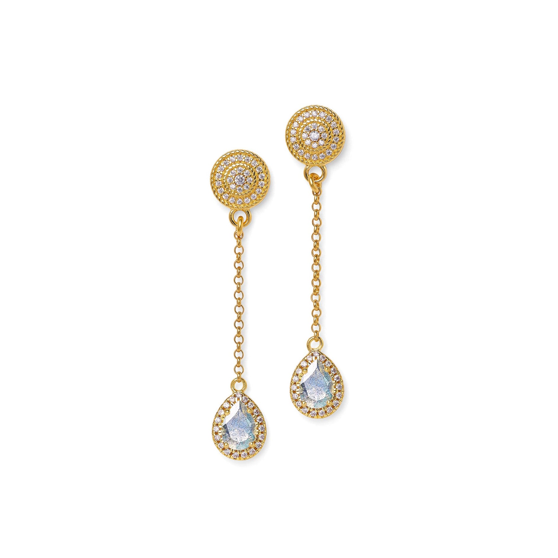 Each earring features a dazzling circular stud, paved with radiant zirconia for a sparkling effect. A delicate gold chain suspends a teardrop-shaped labradorite gemstone, surrounded by a halo of glittering zirconia. The labradorite's natural iridescence adds a captivating play of color, beautifully complemented by the warm 24-karat gold plating.