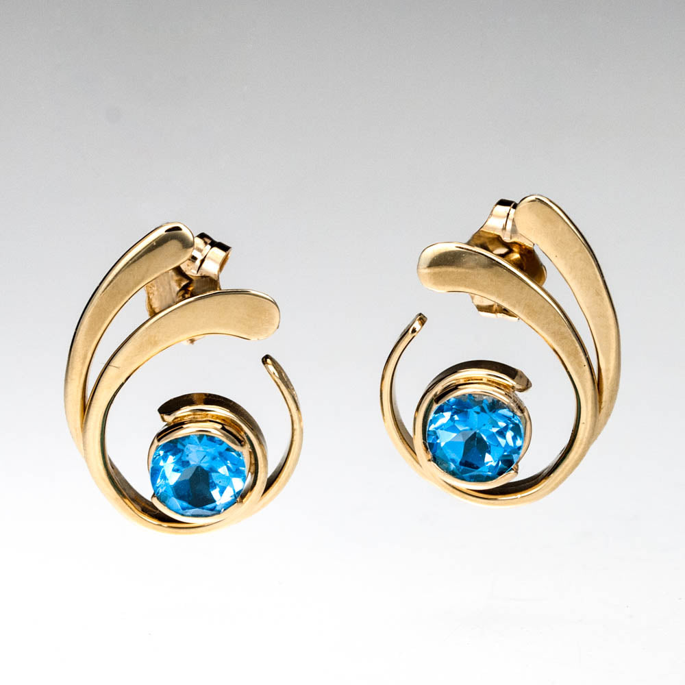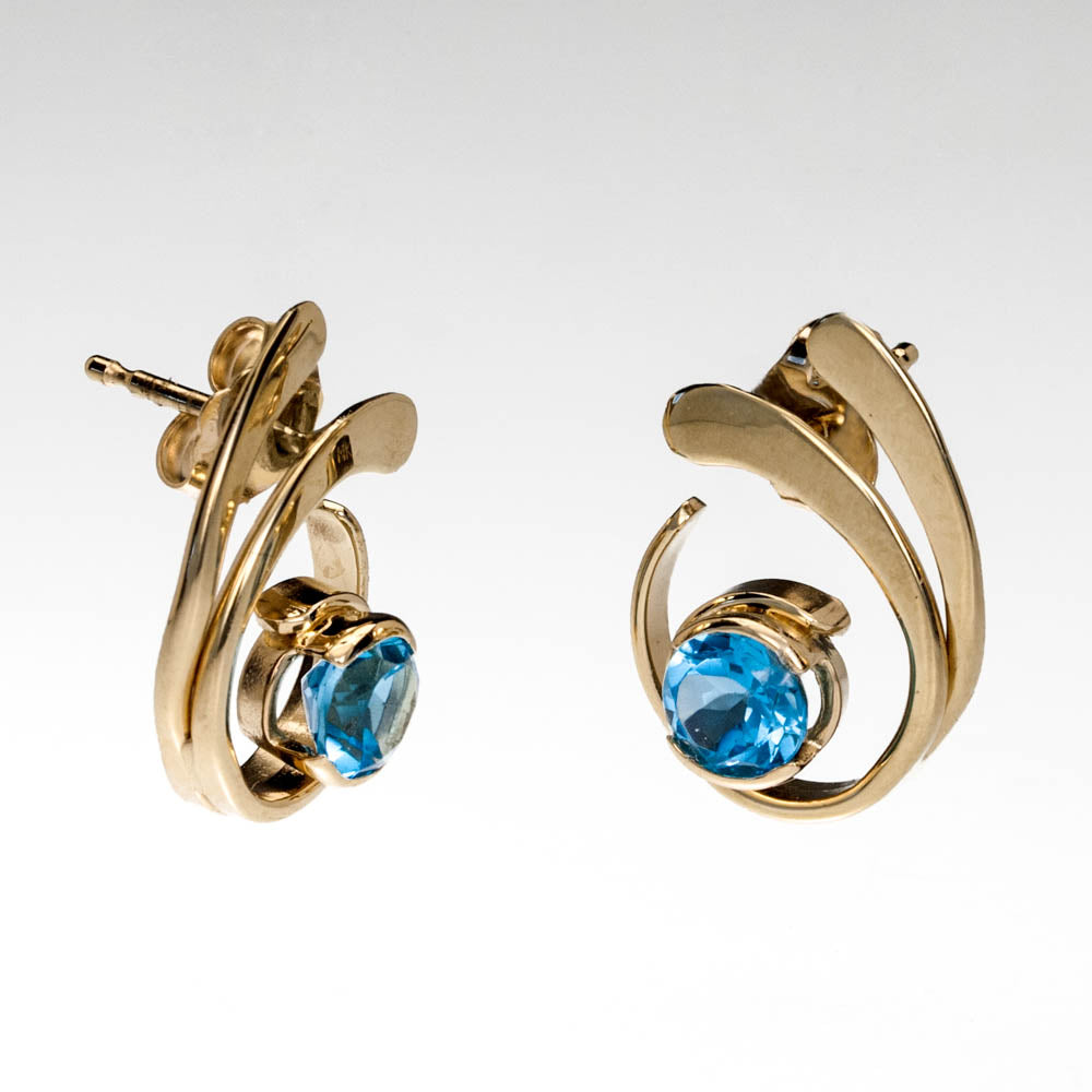 Regular price $1,125.00 Save $-1,125.00Four Curl Earrings in 14kt Yellow Gold - Blue Topaz - Two Wires separate at the top curve around and meet at the side of the earring then split apart again - The wire curling to the center holds a 5mm round partial bezel set Blue Topaz - One gemstone per earring - Hand Forged and Fabricated - Post and Nut