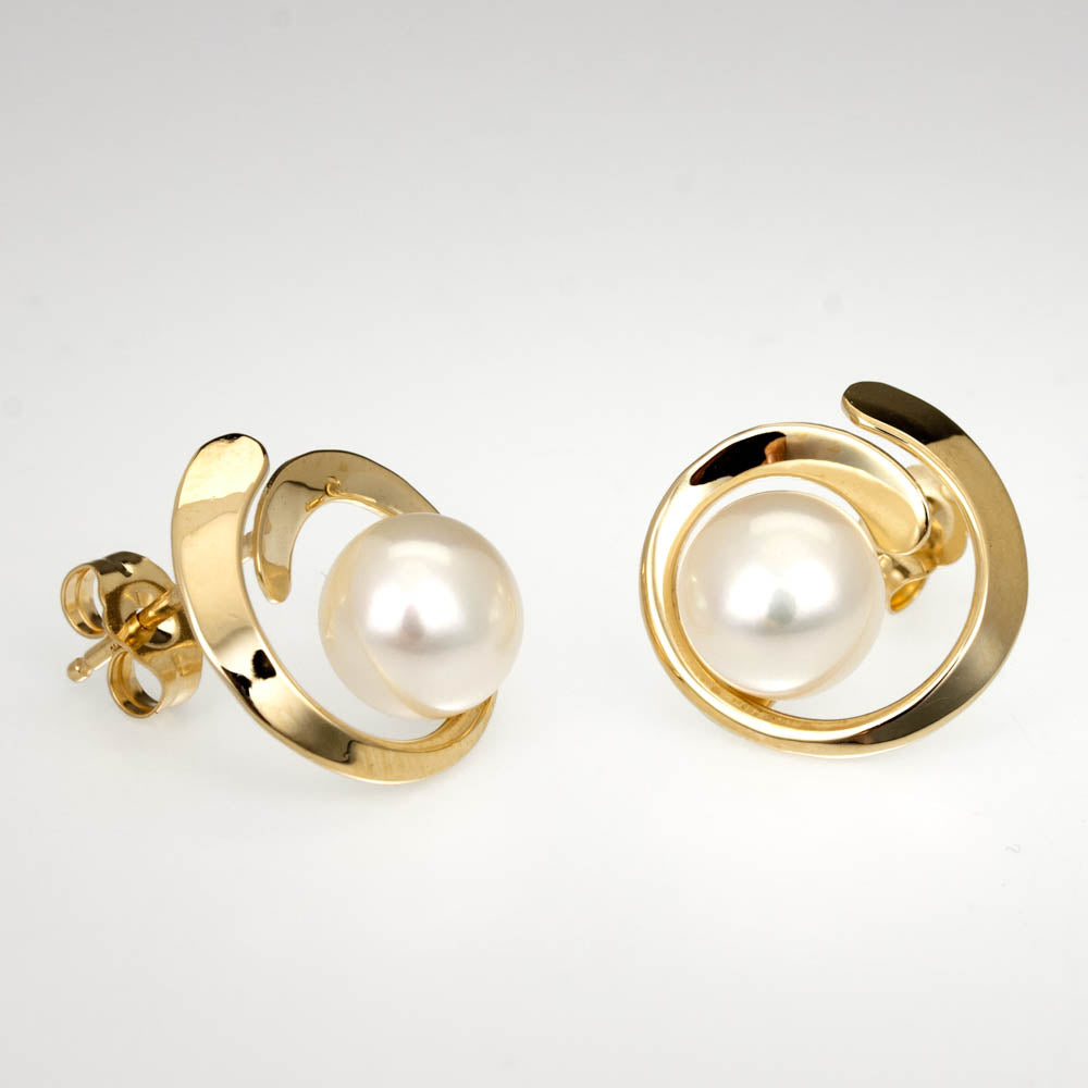 Regular price $1,000.00 Save $-1,000.00Overlap Earrings in 14kt Yellow Gold - White Pearl - Thin open circle button style stud earrings of hammered wire that slightly overlaps at the top - There is one partial bezel set 8mm round cultured fresh water white pearl set at the open center of each earring - Post and Nut with the post set in the middle of the top wire - Hand Forged and Fabricated - Earrings measure a total of 15mm long by 14mm wide by 2mm deep