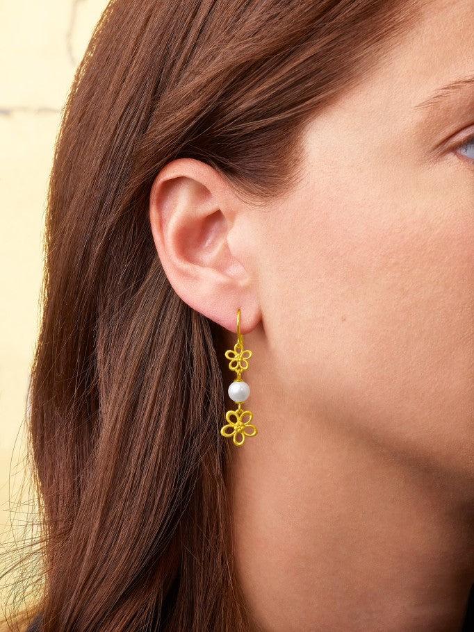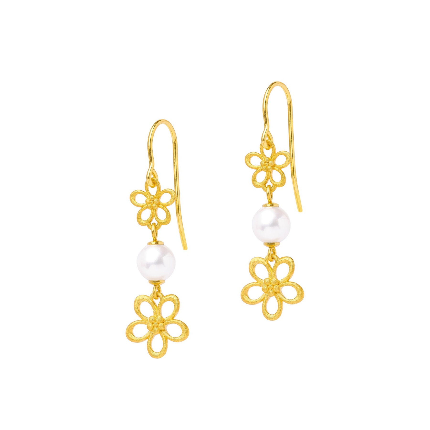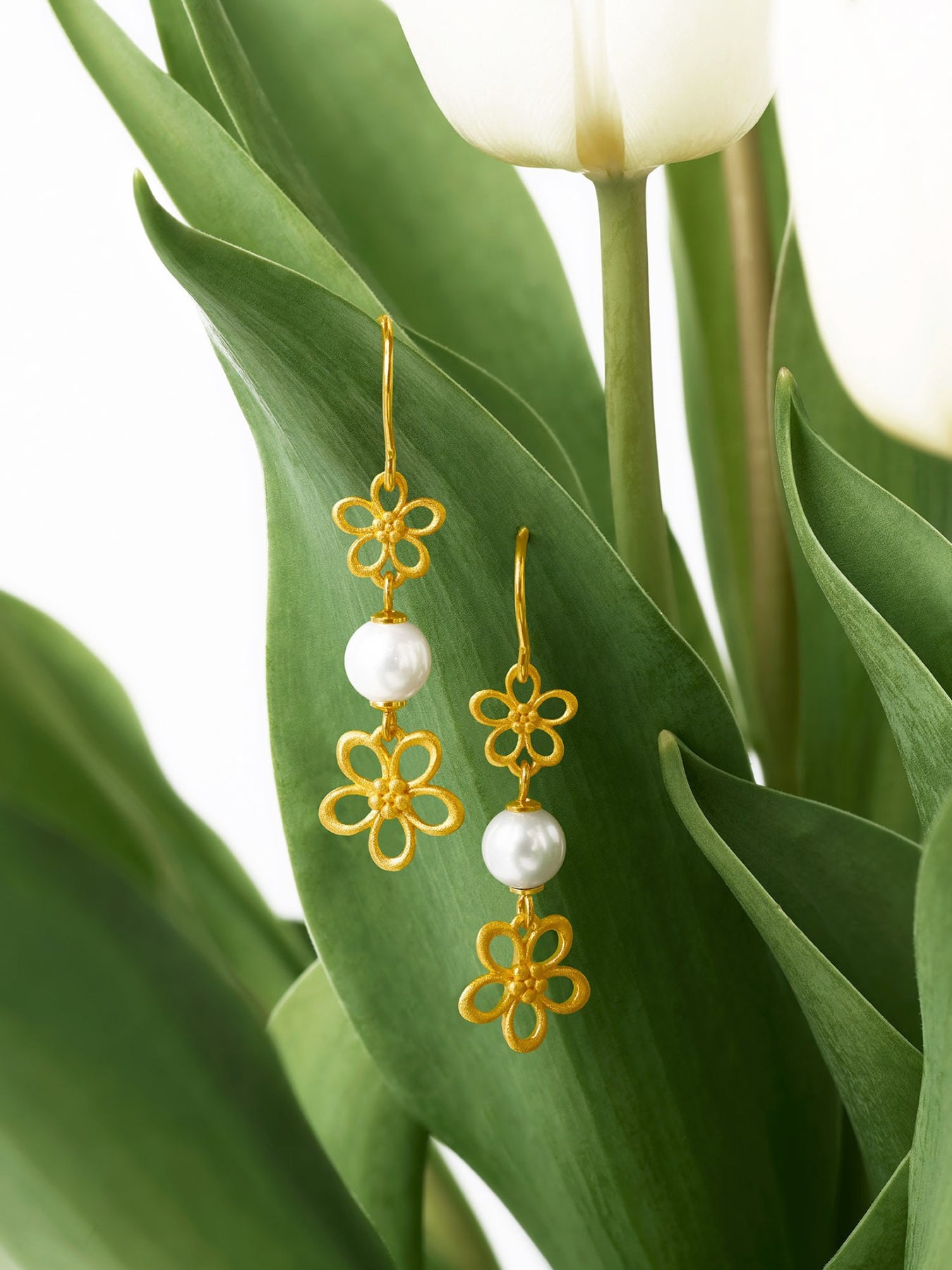 Featuring intricate golden floral motifs plated with radiant 24-karat gold, the design is both lightweight and captivating. Suspended between the flowers is a luminous freshwater pearl, adding a classic touch to the playful, nature-inspired design. The drop style and gentle movement make these earrings a perfect choice for any occasion, from casual outings to formal events.