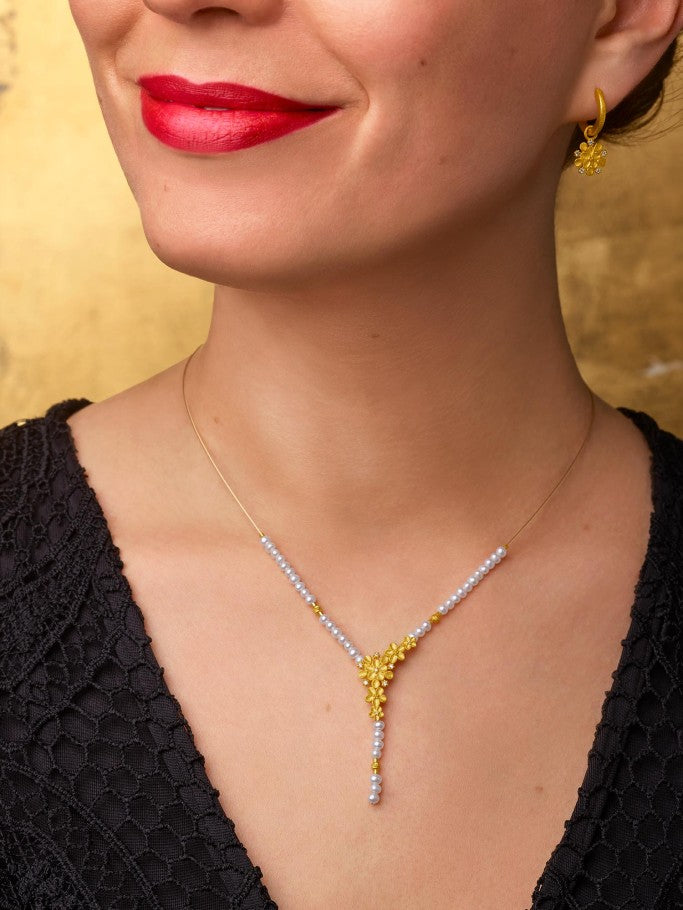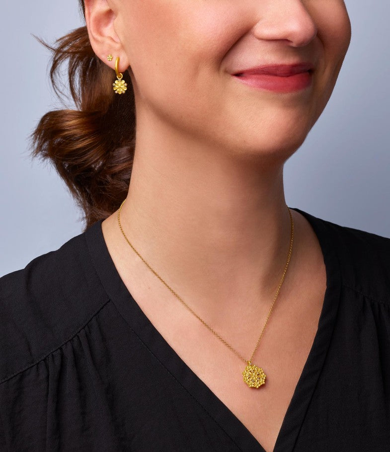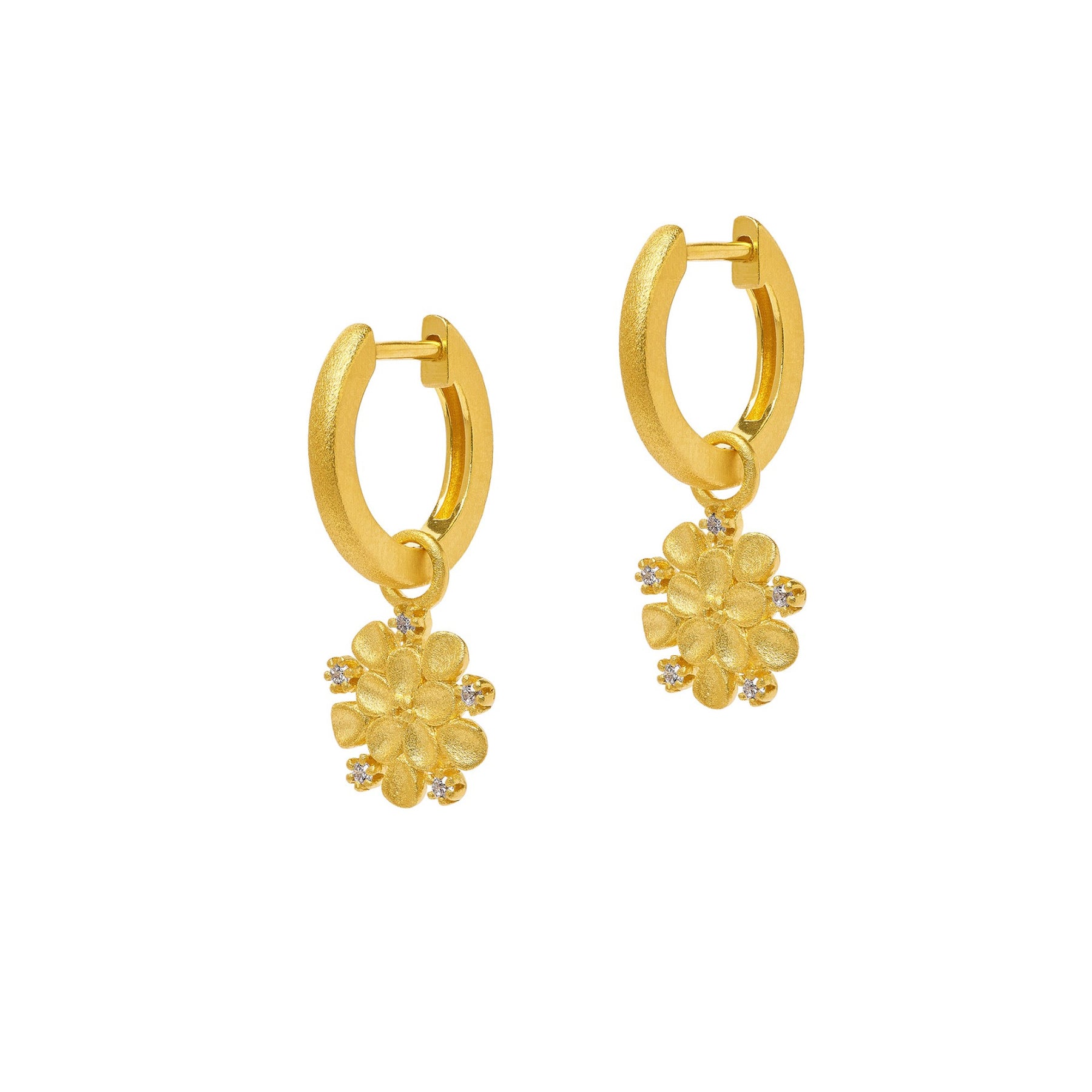 Featuring petite golden flower pendants, each adorned with sparkling zirconia accents, the design exudes natural beauty. The flowers dangle gracefully from sleek, gold-plated hoops, creating a dynamic yet lightweight accessory that moves beautifully with you. The warm 24-karat gold plating adds a luxurious finish to these versatile earrings.