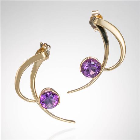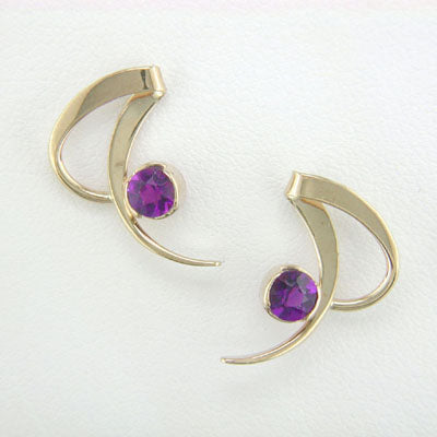 Regular price $615.00 Save $-615.00Gemstone Curve Earrings in 14kt Yellow Gold - Amethyst - AVAILABLE IN TWO SIZES - Swooping wire earring has two wires -The wire in the front bows slightly and the other makes a more dramatic curve out to the side and returns much shorter than the front wire and crosses behind it - At the very tip of the back wire sits a 6mm partial bezel set Amethyst - Post and Nut with post set at the top of the earring - Hand Forged and Fabricated - This style is available in two sizes - Small measures 16mm long by 9.5mm across - Large measure a total length of 26mm by 13mm at the widest point by 1mm deep