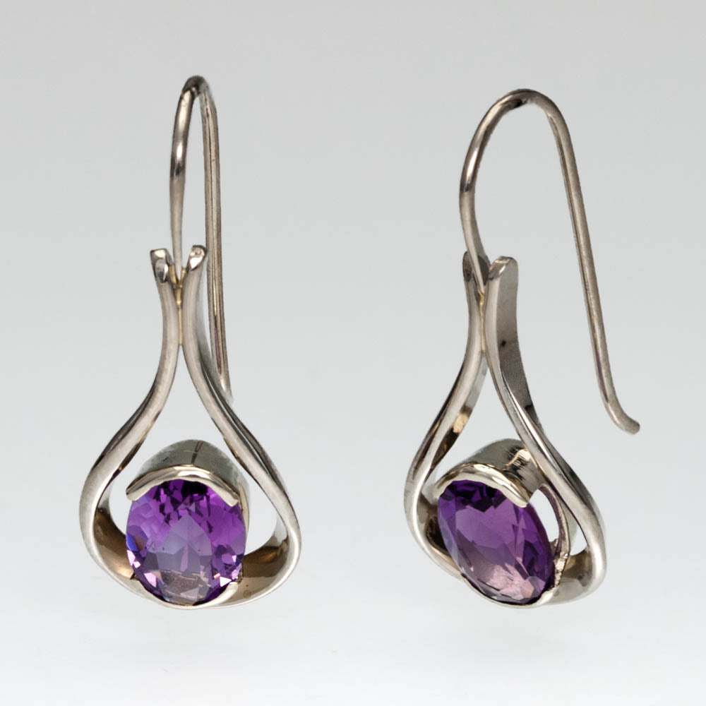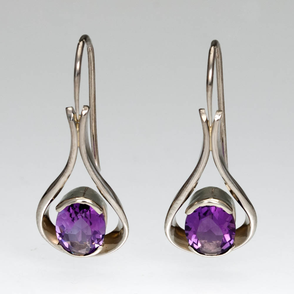 Regular price $1,295.00 Save $-1,295.00Raindrop Earrings in 14kt White Gold - Amethyst - Open droplet shaped earrings with a partial bezel set 8mm by 6mm oval Amethyst placed at the bottom center of the open design - Continuous Ear Wire - Hand Forged and Fabricated - Earrings measure a total length of 27mm by 11mm at the widest point by 2.5mm deep