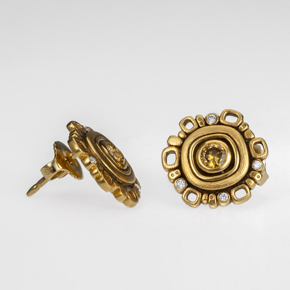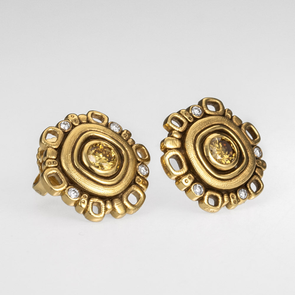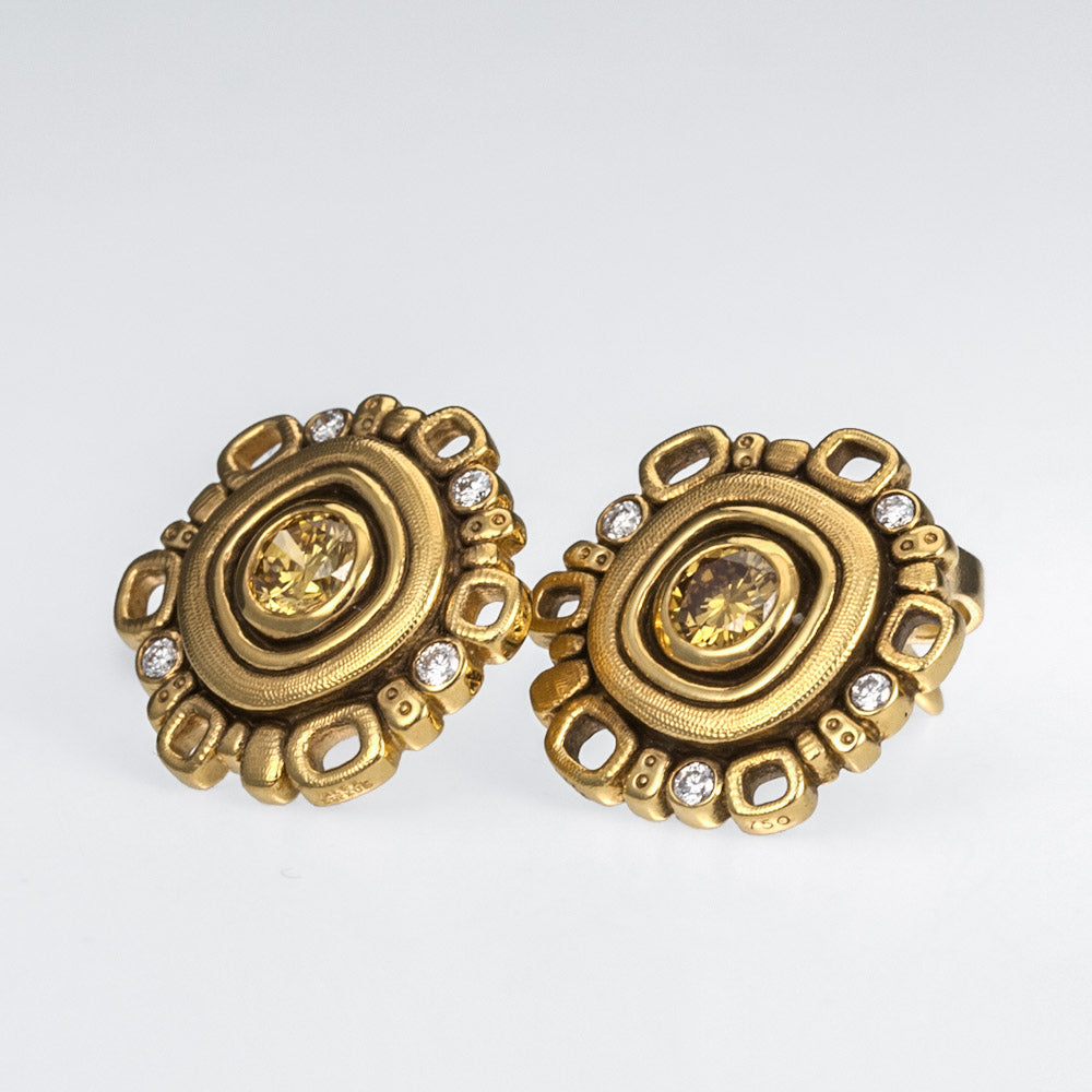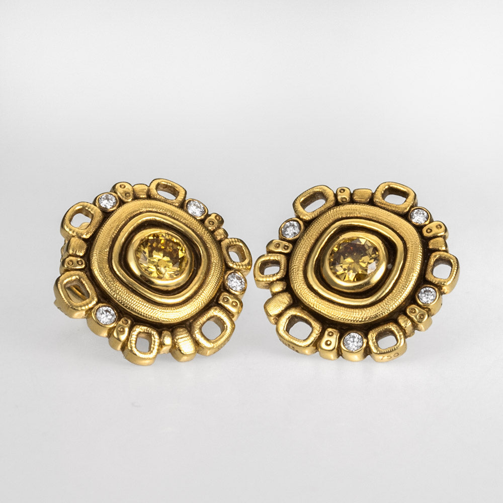 Regular price $8,015.00 Save $-8,015.00Natural Color and White Diamond Earrings in 18kt Yellow Gold - Micro Windows - Round profile with open and closed textured rectangular shapes along the rim - There are eight small round bezel set white diamonds that adorn the rim of the earring design while two larger Natural Color Diamonds sit flush set at the center - The eight diamonds have a total carat weight of 0.08ct - the 2 natural color diamonds have a total carat weight of 0.35ct - Color of Natural Diamonds will vary by order - Post and Nut back - Hand Hammered and Textured and Oxidized - Earrings measure 13mm in diameter by 3mm deep with the post placed 4mm down from the top
