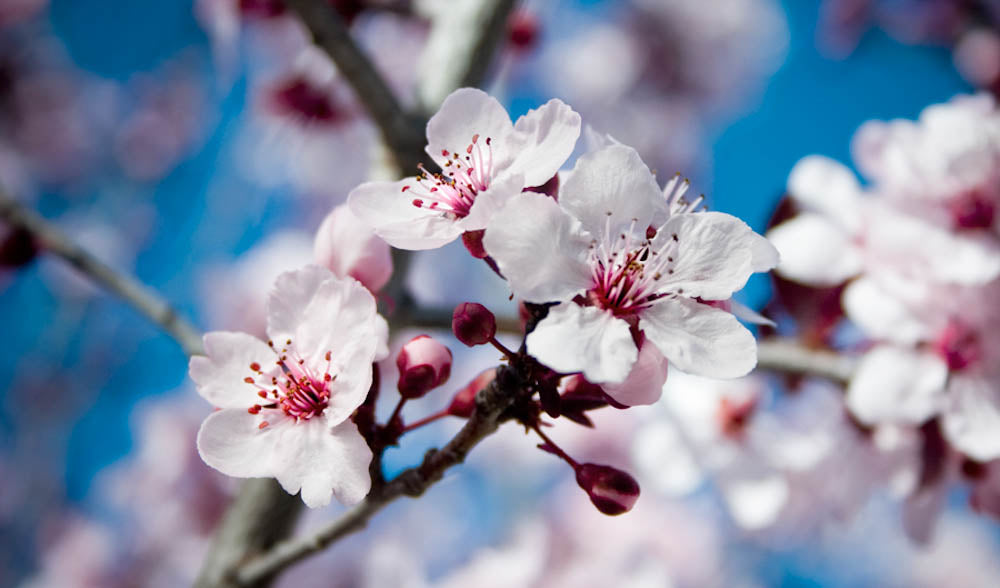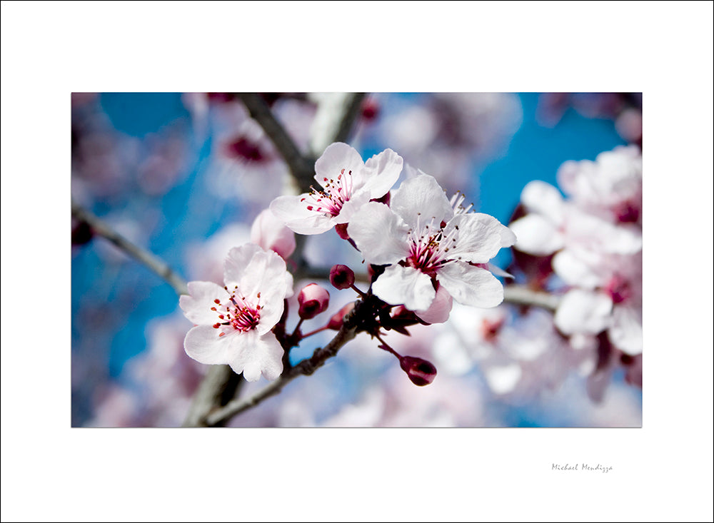 Plum Blossoms on branches in foreground with medium blue sky in the background - Horizontal orientation - Archival quality