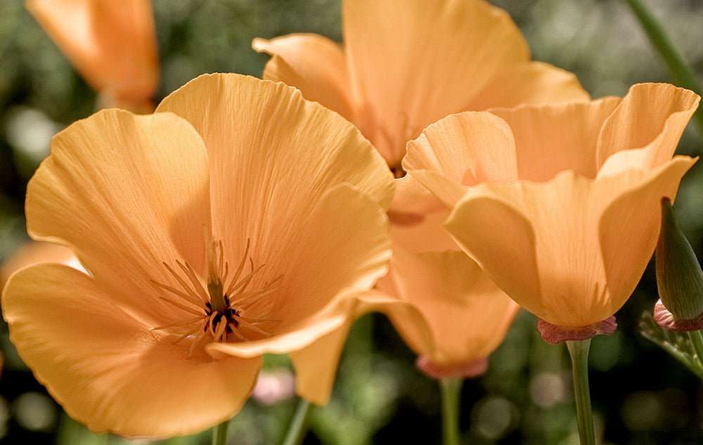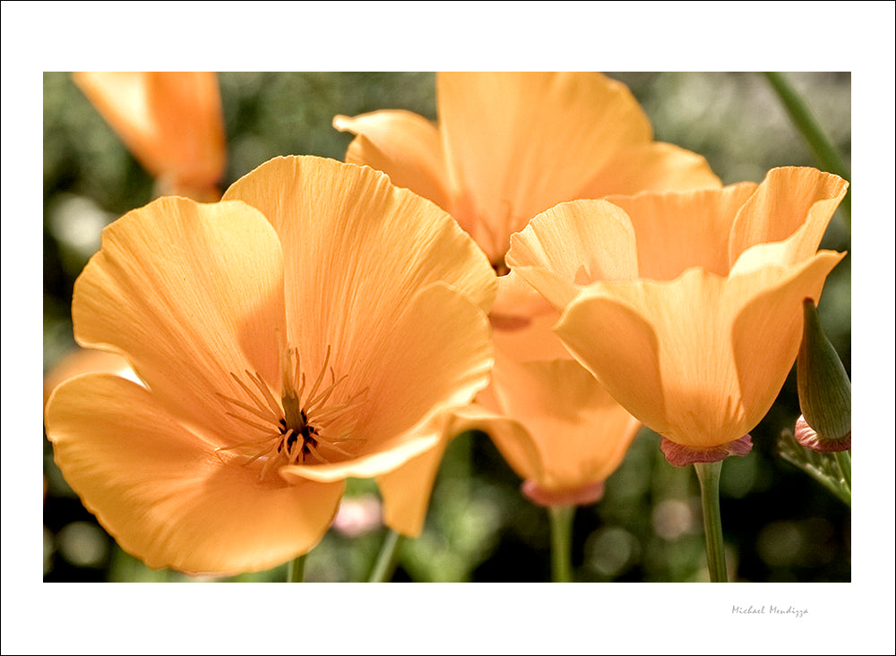 Three orange California poppies in close-up against a natural backdrop - Horizontal orientation - Archival quality