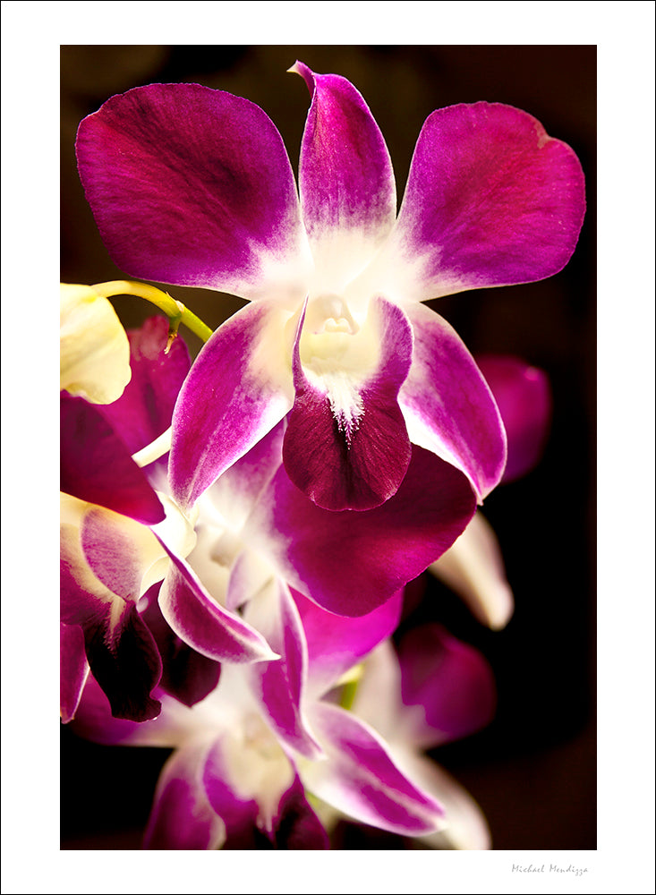 Magenta Dendrobium Orchids with white centers against a black background - Vertical orientation - Archival quality