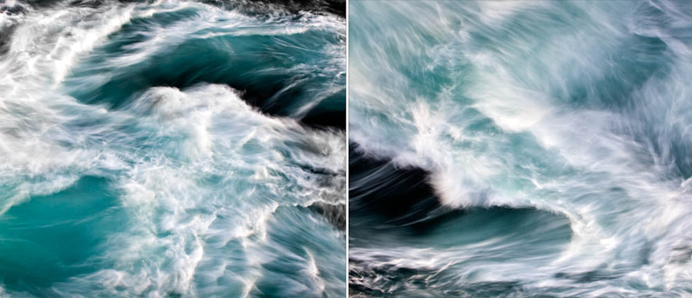 Impressionistic seascape - Infinity Left and Infinity Right are paired together as a diptych named Creation - Turquoise water from dark to light with white caps - Left and Right views - Paired as a set - Horizontal orientation - Archival quality