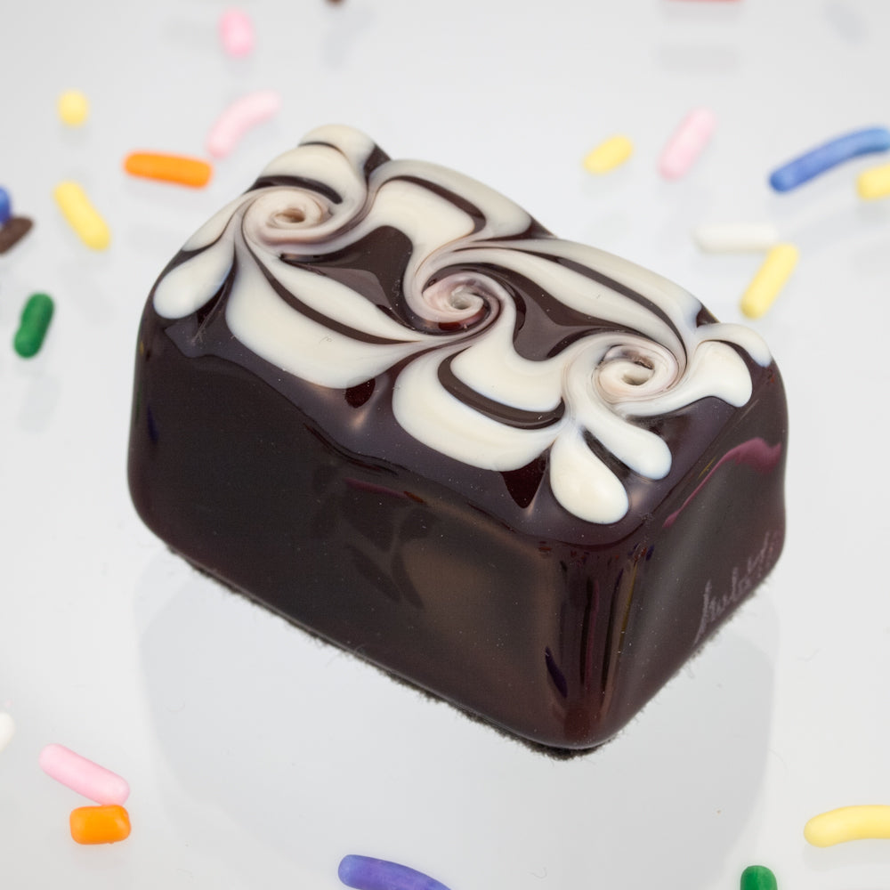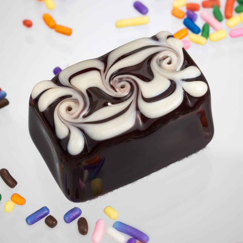 Regular price $50.00 Save $-50.00Chocolate - Bar Shape - Gourmet Collection - Vanilla Raked Amira Chocolate - Chocolate base with raked Vanilla swirled design on the top - measures approximately 2.5cm tall by 3.5cm wide by 2.5cm deep