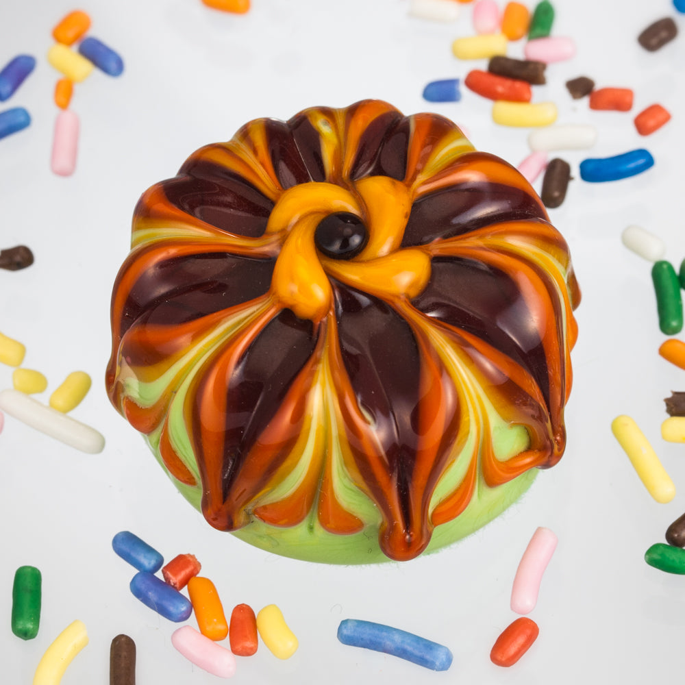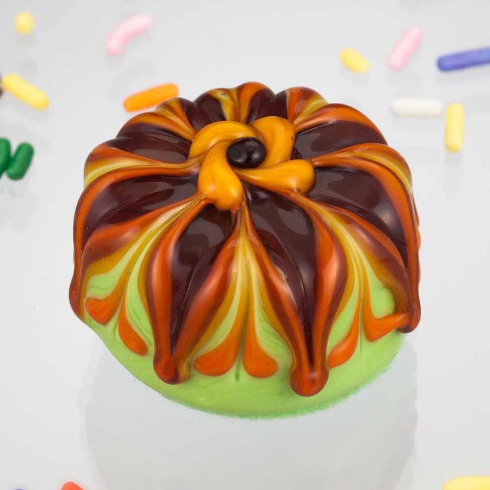 Regular price $50.00 Save $-50.00Chocolate - Round Shape - Hearts & Flowers Collection - Pistachio and Chocolate Belea Aster Chocolate - Pistachio base with Chocolate icing on top and accented with touches of Mango and Caramel - measures approximately 2.5cm tall by 3.5cm in diameter