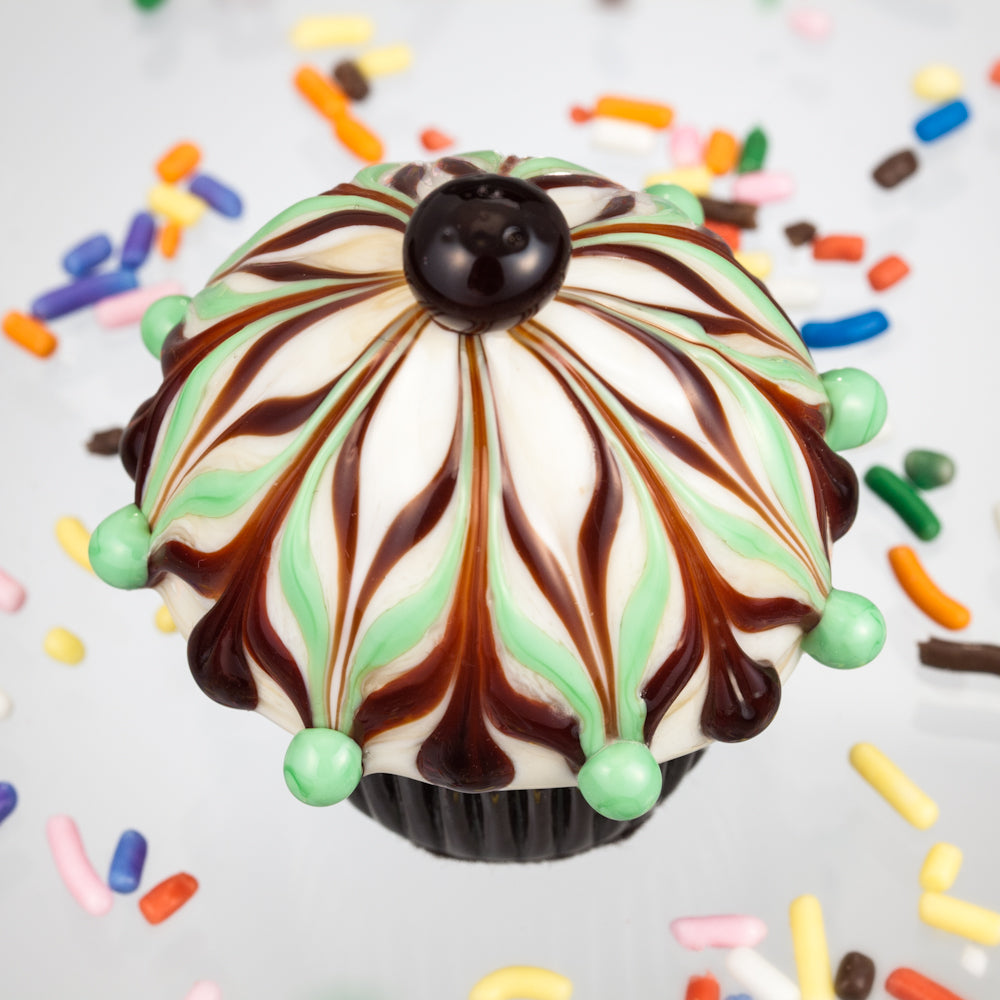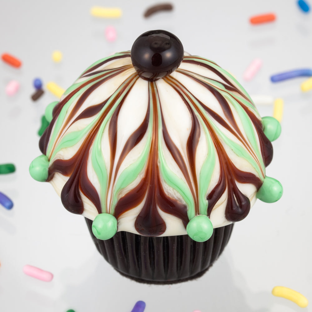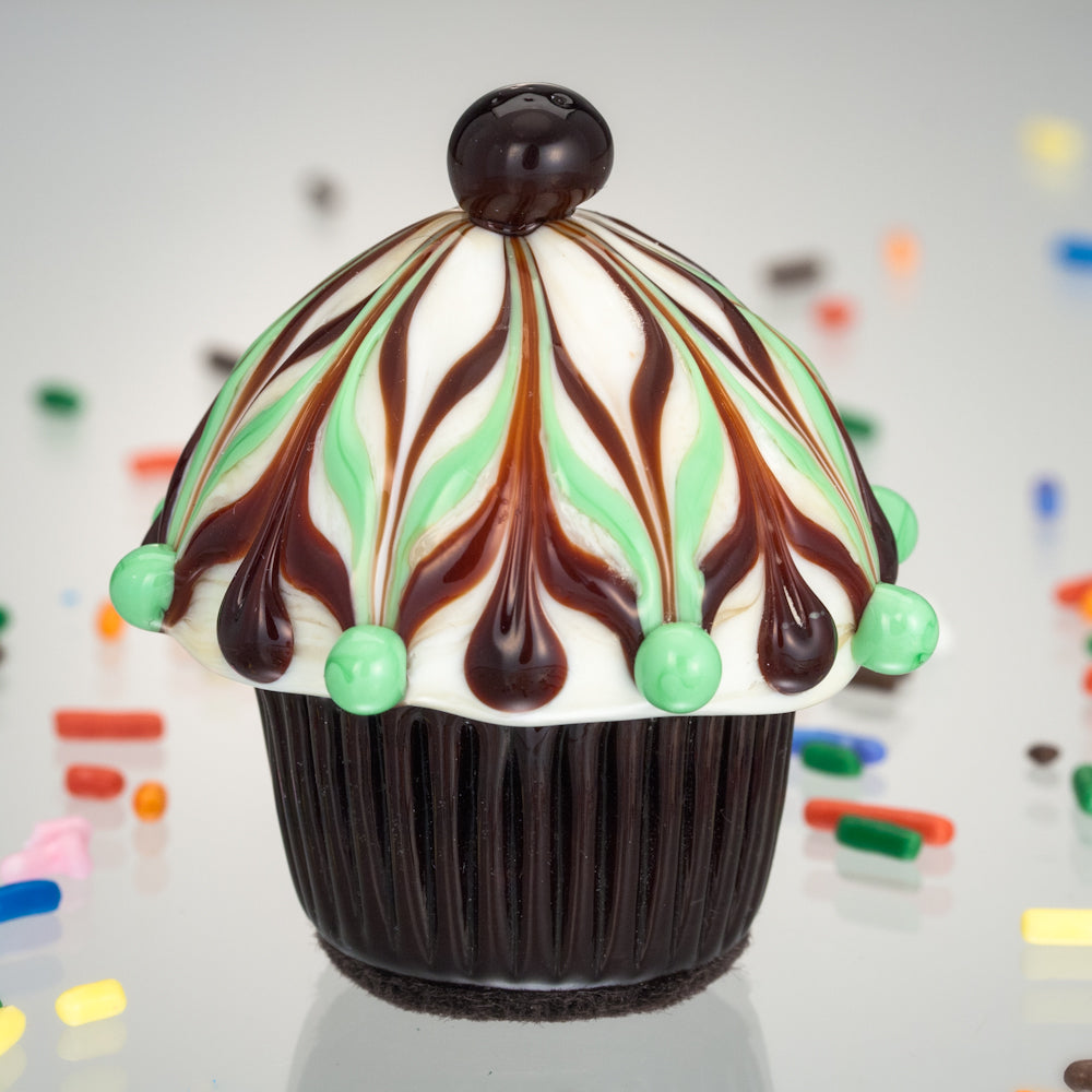 Mmmmmm… mint and chocolate, a classic combination, deliciously sculpted in solid art glass! A dark chocolate cupcake truffle topped with shiny white frosting and meticulously handcrafted embellishment in fudge and minty green. Hulet Glass confections are so fun to collect, you'll want one of every flavor! Each unique candy is individually signed, dated, mounted on a felt pad and nestled in its own paper cup and dainty box.