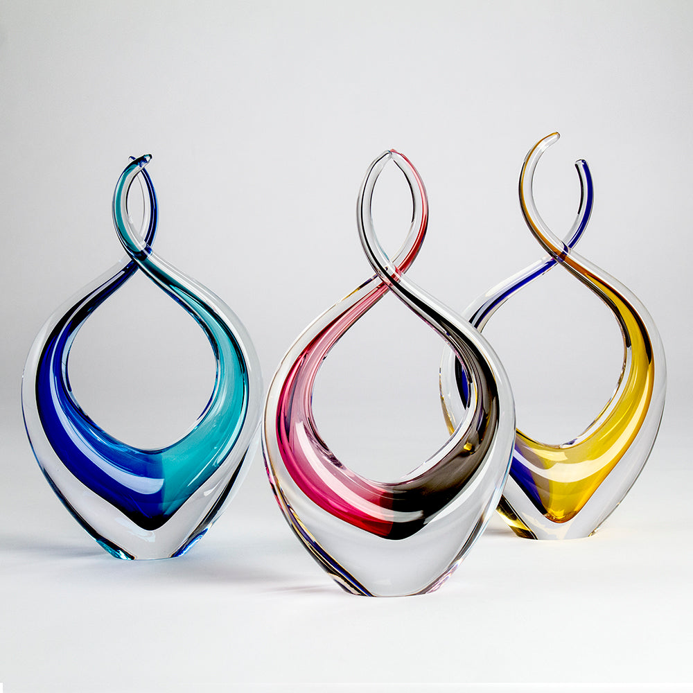 Regular price $185.00 Save $-185.00An expression of fluidity and harmony, the Dancing glass sculpture captures the essence of movement in its most elegant form. Two slender arcs rise from a solid base, intertwining in a delicate embrace before unfurling into graceful, outstretched curves. Their form suggests the poised movements of a duet, an eternal dance frozen in time—where balance, rhythm, and connection take center stage.