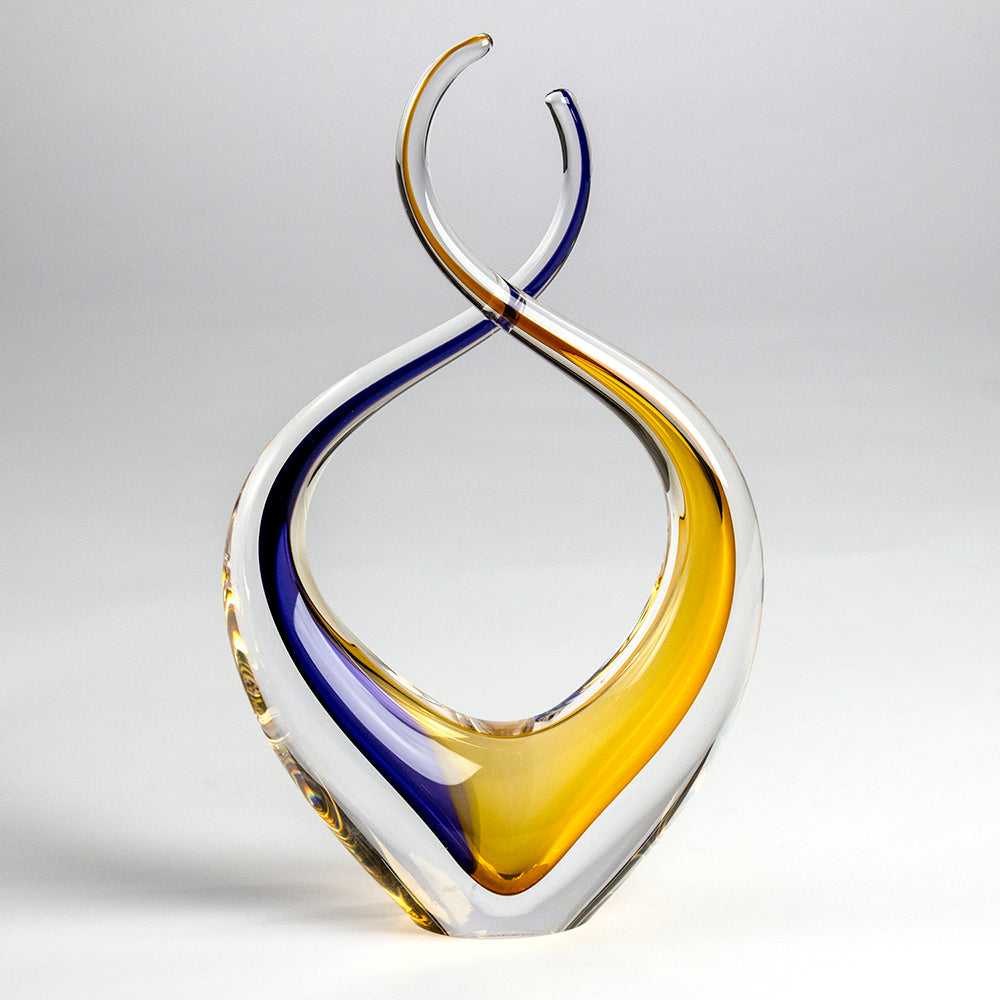 Swirls of deep sapphire blue and golden amber flow seamlessly within the crystal-clear glass, their luminous hues merging and contrasting like partners in perfect sync. The transparency of the piece allows light to filter through, casting mesmerizing reflections that shift with every angle and illumination.