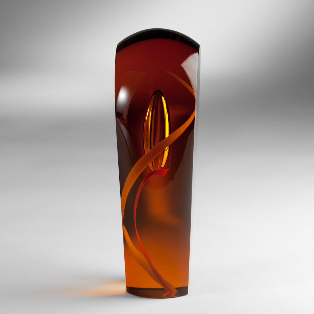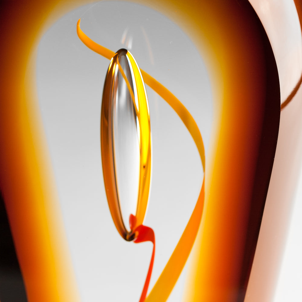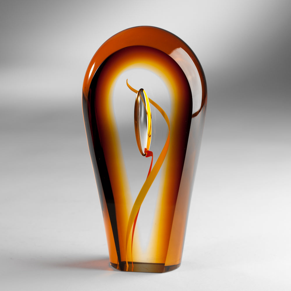 Regular price $425.00 Save $-425.00Shall we dance? This contemporary art glass contains a fusion of ethereal amber color that creates a soft, warm glow. The single, elongated bubble is gracefully encircled by a bright orange and yellow ribbon that are dancing in perfect synchronicity. Hand-blown, polished and cut. The sides are softly curved with the front and back perfectly flat.