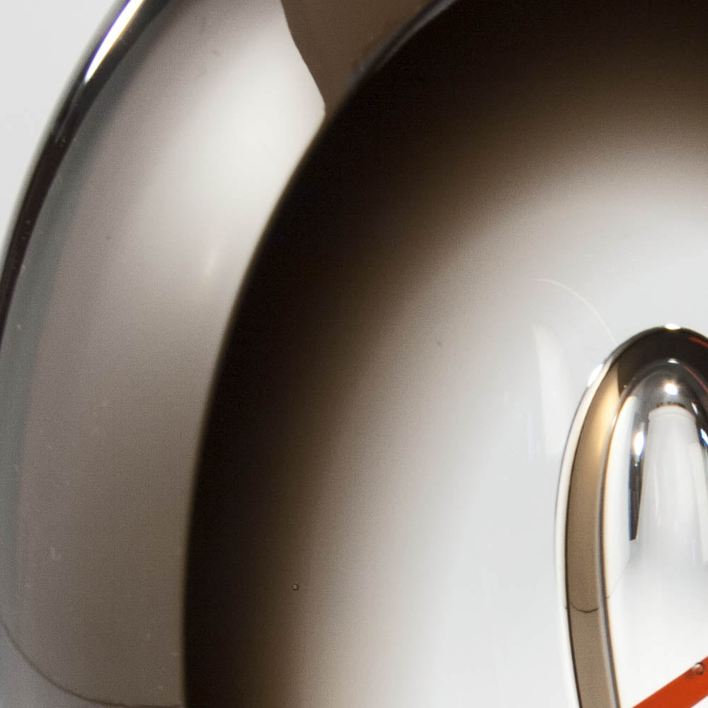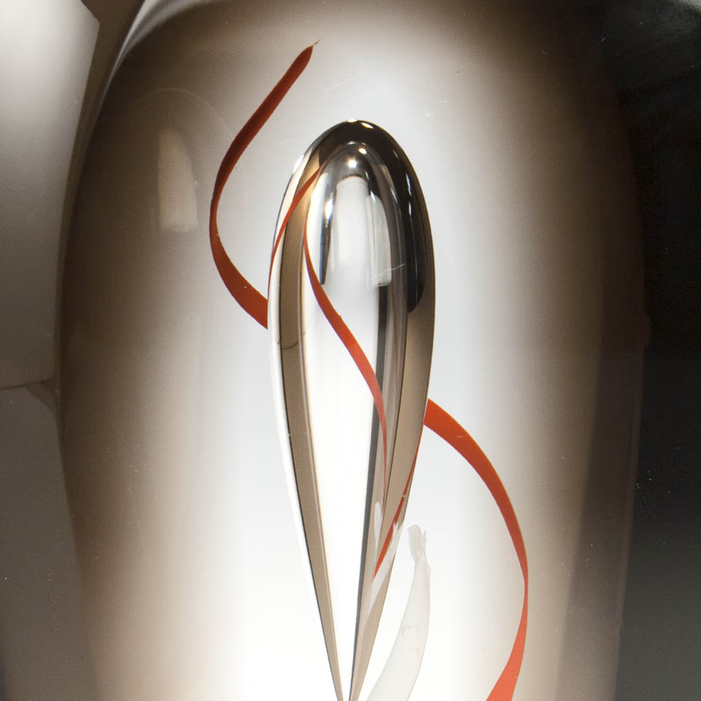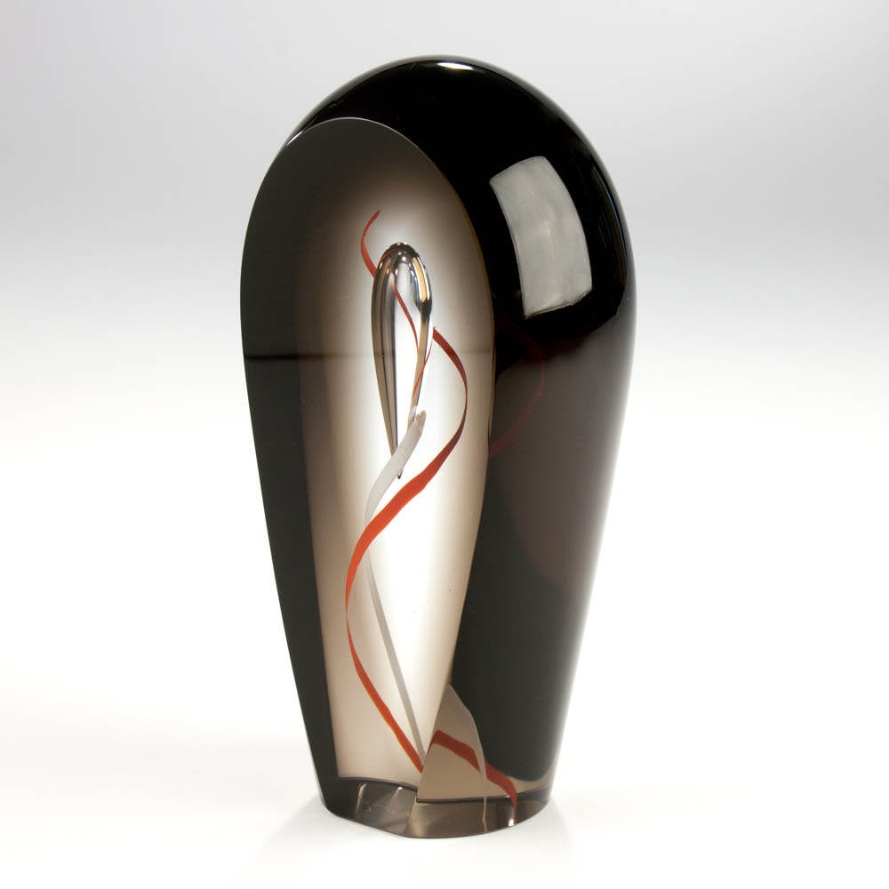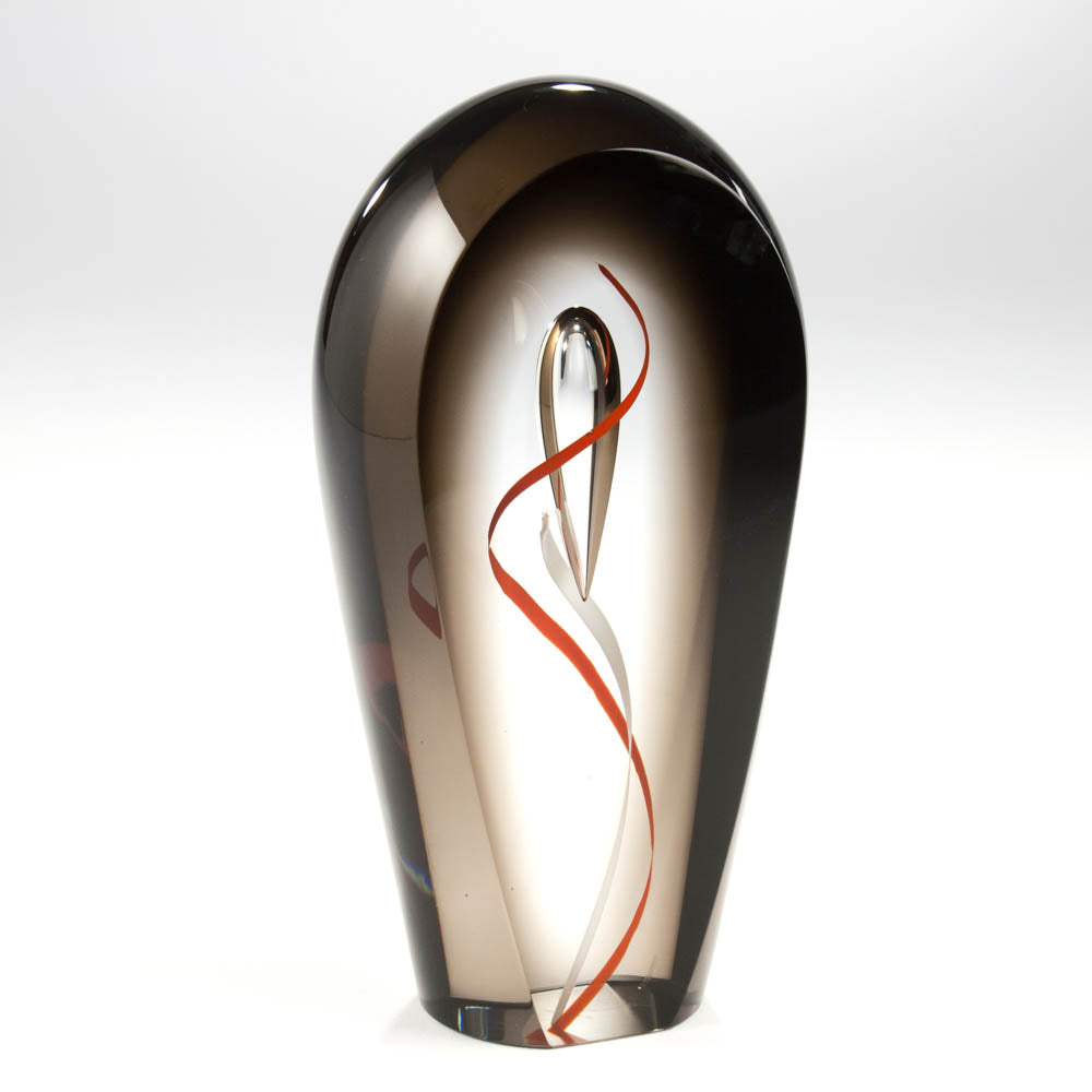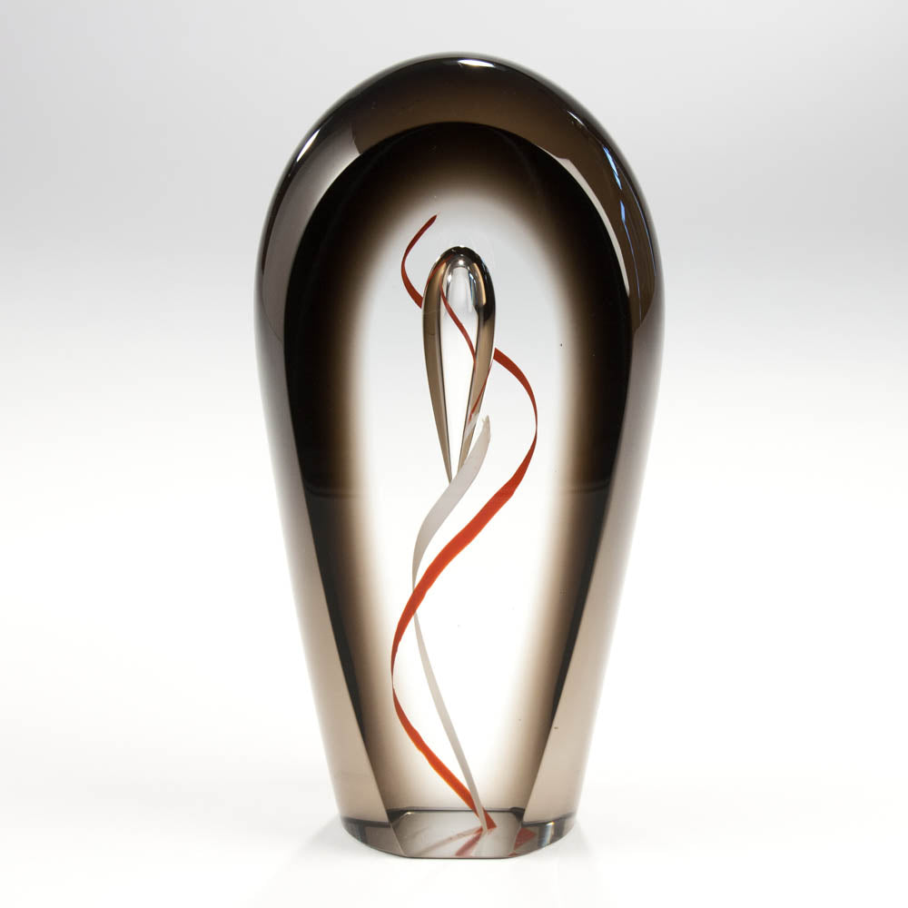 Teardrop shaped Smoke Grey Paperweight, cut front and back, with two ribbons and a bubble at the center - one ribbon in red and the other in white - 19cm tall x 9cm wide x 6cm deep.