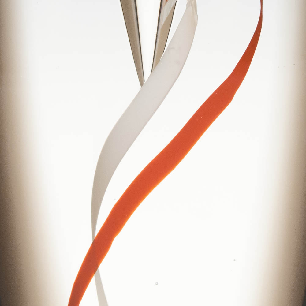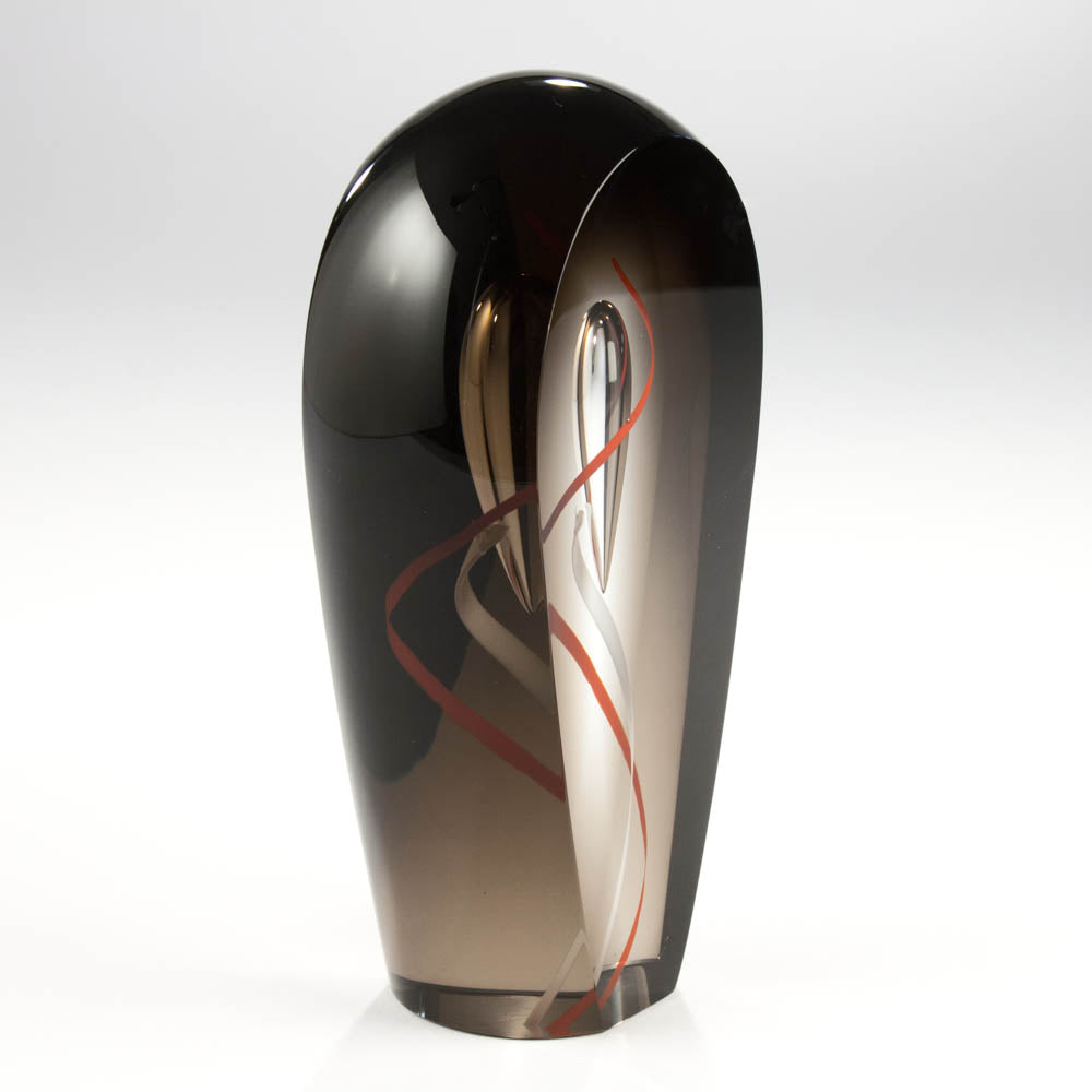 Shall we dance? This contemporary art glass contains a fusion of ethereal red that creates a soft, warm glow. The single, elongated bubble is gracefully encircled by two bright red ribbons that are dancing in perfect synchronicity. Hand-blown, polished and cut. The sides are softly curved with the front and back perfectly flat.