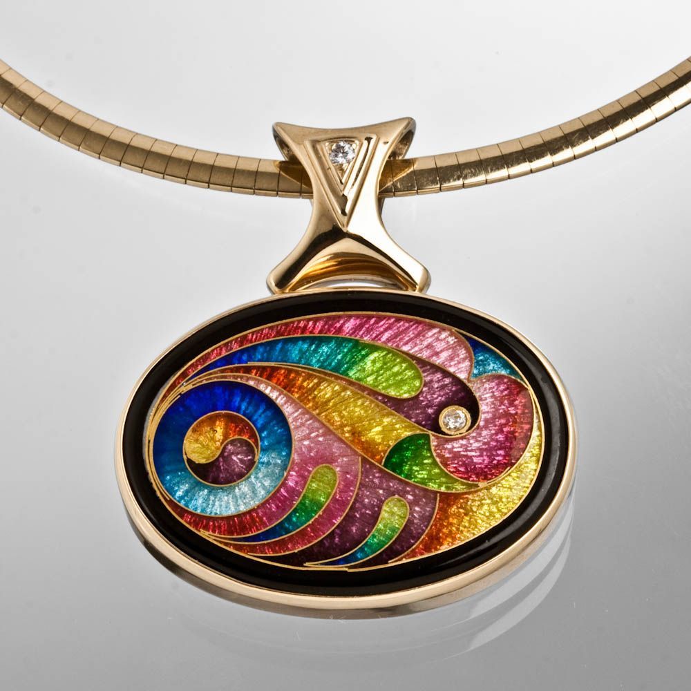 Pendant Style: Horizontal Oval Cloisonné Enamel and Diamond Pendant