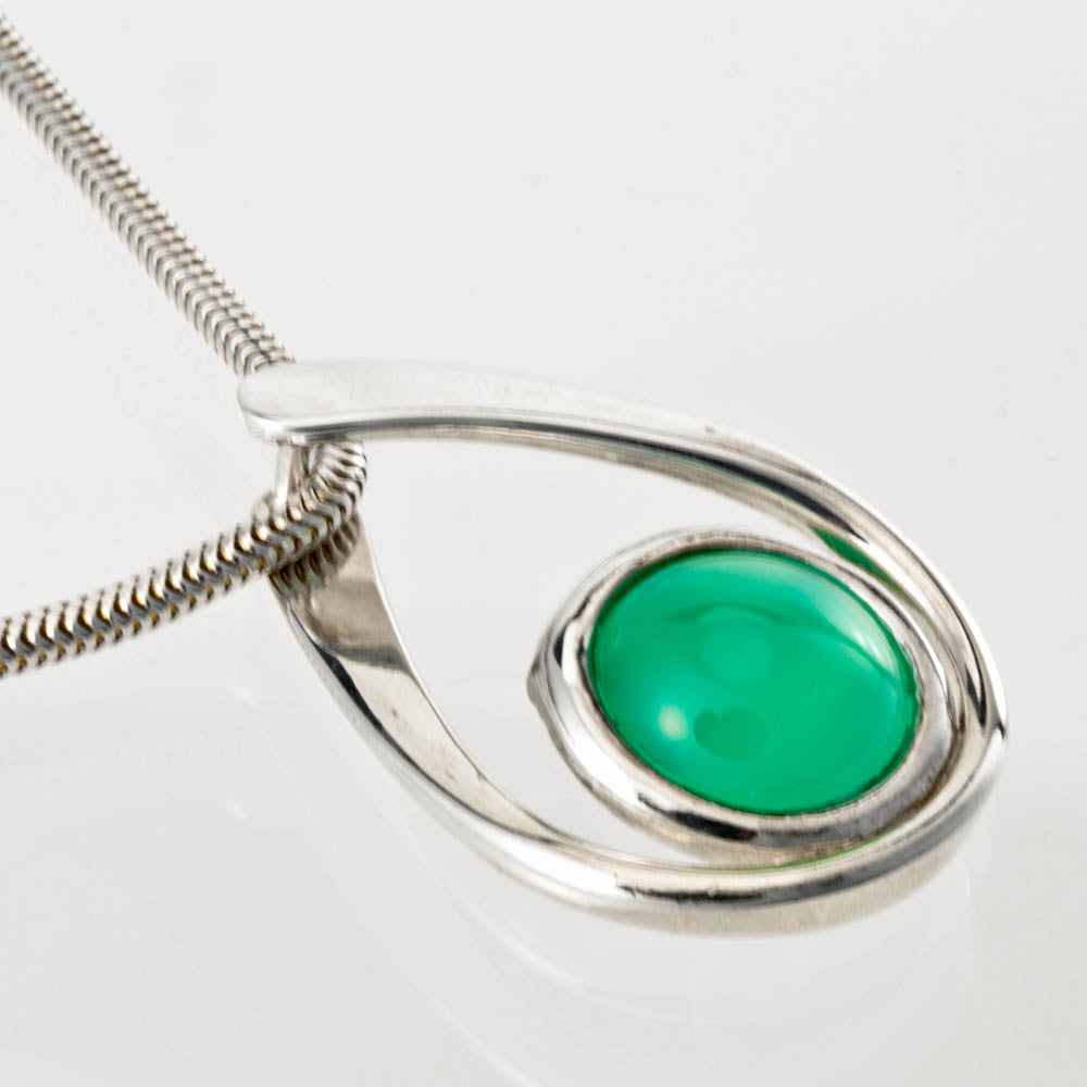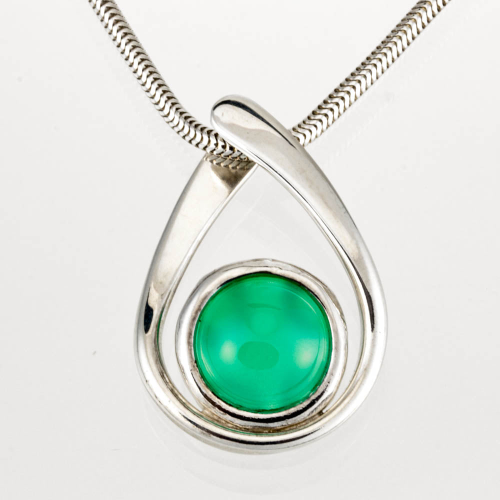 Droplet Pendant in Argentium Silver - Chrysoprase - Open egg shape design holds a single 10mm round bezel set cabochon cut Chrysoprase at the center of the open bottom - Hand Forged Chain is sold separately and is not included in price