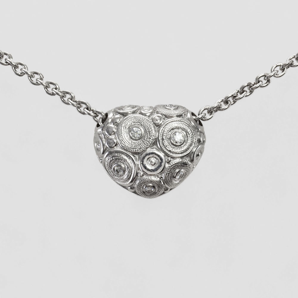 Regular price $3,425.00 Save $-3,425.00Heart Shape Pendant Style Necklace in Platinum - White Diamonds - Small heart design with textured curlicues and 6 round white bezel set diamonds - The diamonds have a total weight of 0.05CTTW a color of F-G and clarity of VVS - Hand Hammered and Textured - Not Antiqued - This pendant measures 11.5mm wide by 9.5mm long by 4mm deep