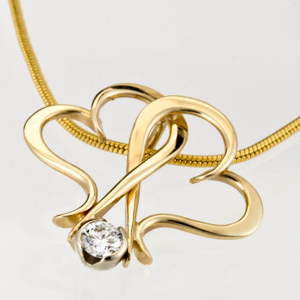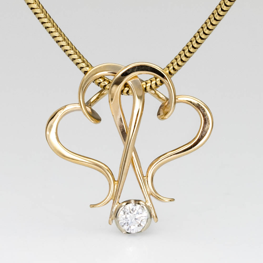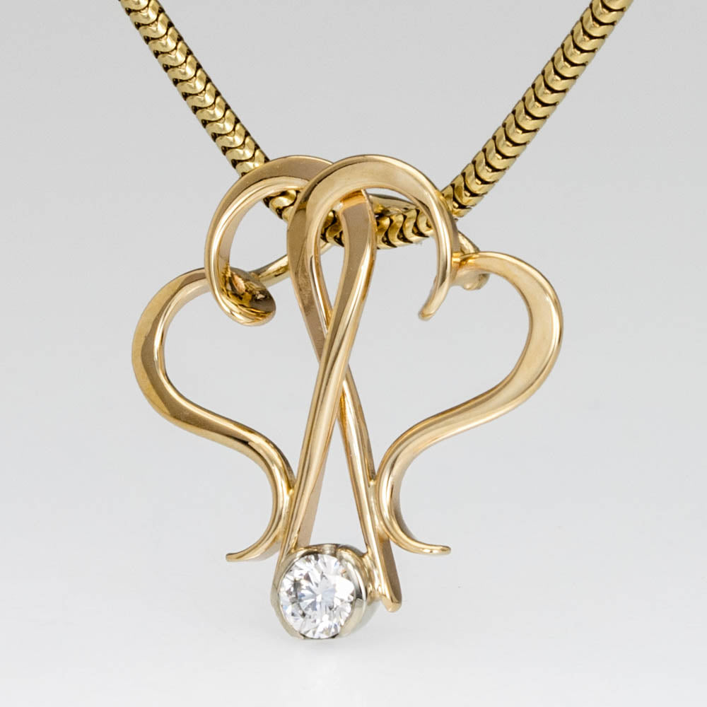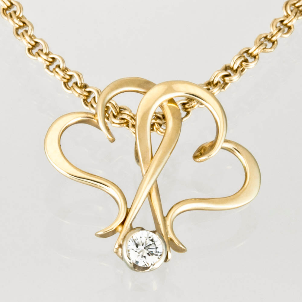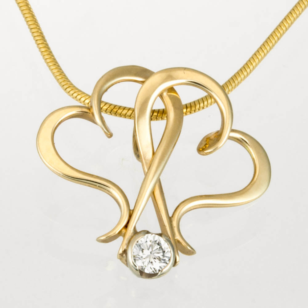 Regular price $805.00 Save $-805.00Double Heart Pendant in 14kt Yellow Gold - Diamond - Two open hearts of equal size that are linked together and overlap at the top - One round .10ct partially bezel set diamond - Bale in the back at the top - Hand Forged - Pendant approximately measures a total length of 17mm deep by 19mm at the widest point by 2mm deep