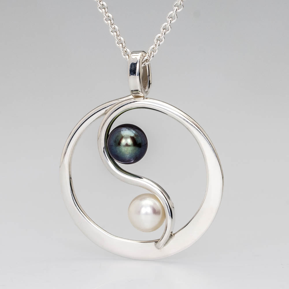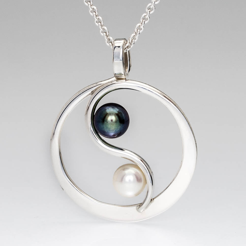 Regular price $345.00 Save $-345.00Yin-Yang Pendant in Argentium Silver - White Pearl and Black Pearl - Open Yin-Yang design with a cultured 6mm round black freshwater pearl set as the upper eye and a cultured white freshwater pearl set as the lower eye - Hand Forged - This pendant measures a total of 33mm in length including the bale by 16mm diameter