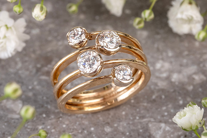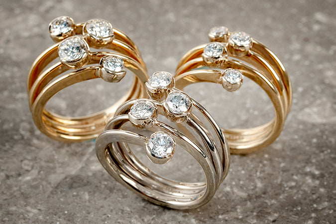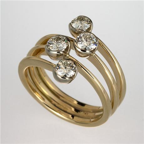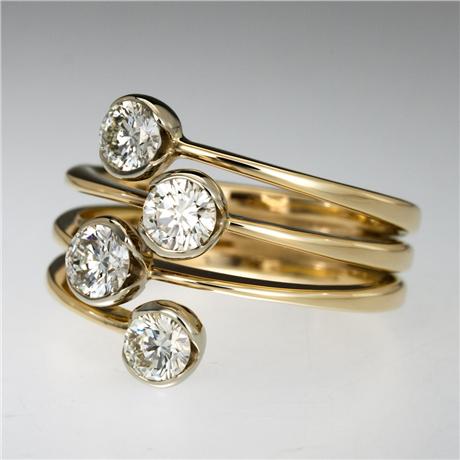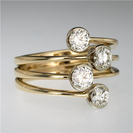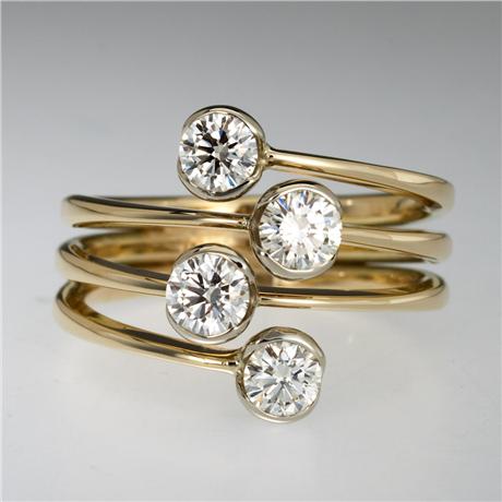 Regular price $7,250.00 Save $-7,250.00Galaxy Ring in 14kt Yellow Gold - White Diamond - Hammered wires openly wrap the finger four times - The top and the bottom wire do not connect at the top but are left open on either side of the two complete wires - Four white diamonds are partially bezel in a somewhat zigzag design - The diamonds have a total carat weight of 1ct - Hand Forged and Fabricated - The ring measures 16mm wide by 5mm deep at the top and it tapers down to 5mm wide by 2mm deep at the back of the finger