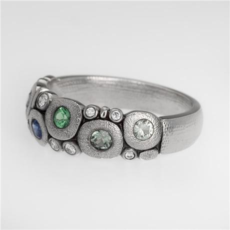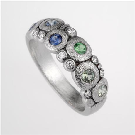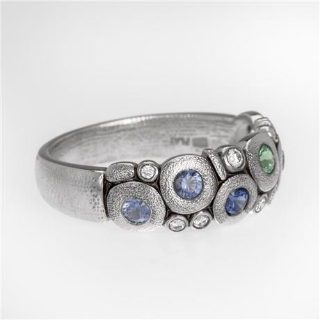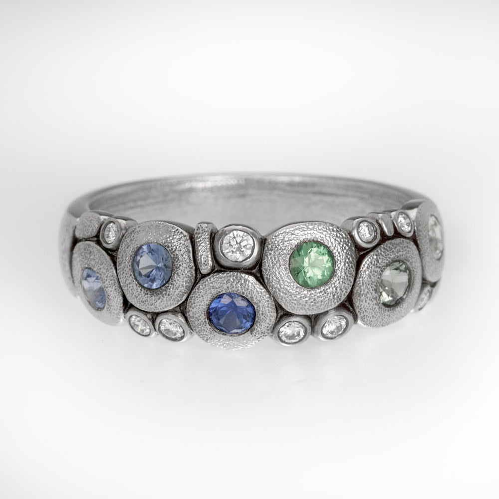 Regular price $5,975.00 Save $-5,975.00What could be sweeter than wearing this Candy ring? Specializing in microscopic sculpting and carving, Alex Šepkus has the ability to press perfection to a level that the human eye can’t see. With a strong understanding and respect for precision and balance, personified by his father, a well-respected architect, Alex developed a great passion for the intricacies of his craft, creating a world that can be truly appreciated only under a microscope. Bezel set fade blue sapphires, green tsavorites and diamonds sparkle in antiqued platinum from the clusters of Šepkus circles perfected with signature texturing. The hand hammering (completed with his custom created tools) continues around the shank of the band. Gemstone colors will vary slightly in each ring.