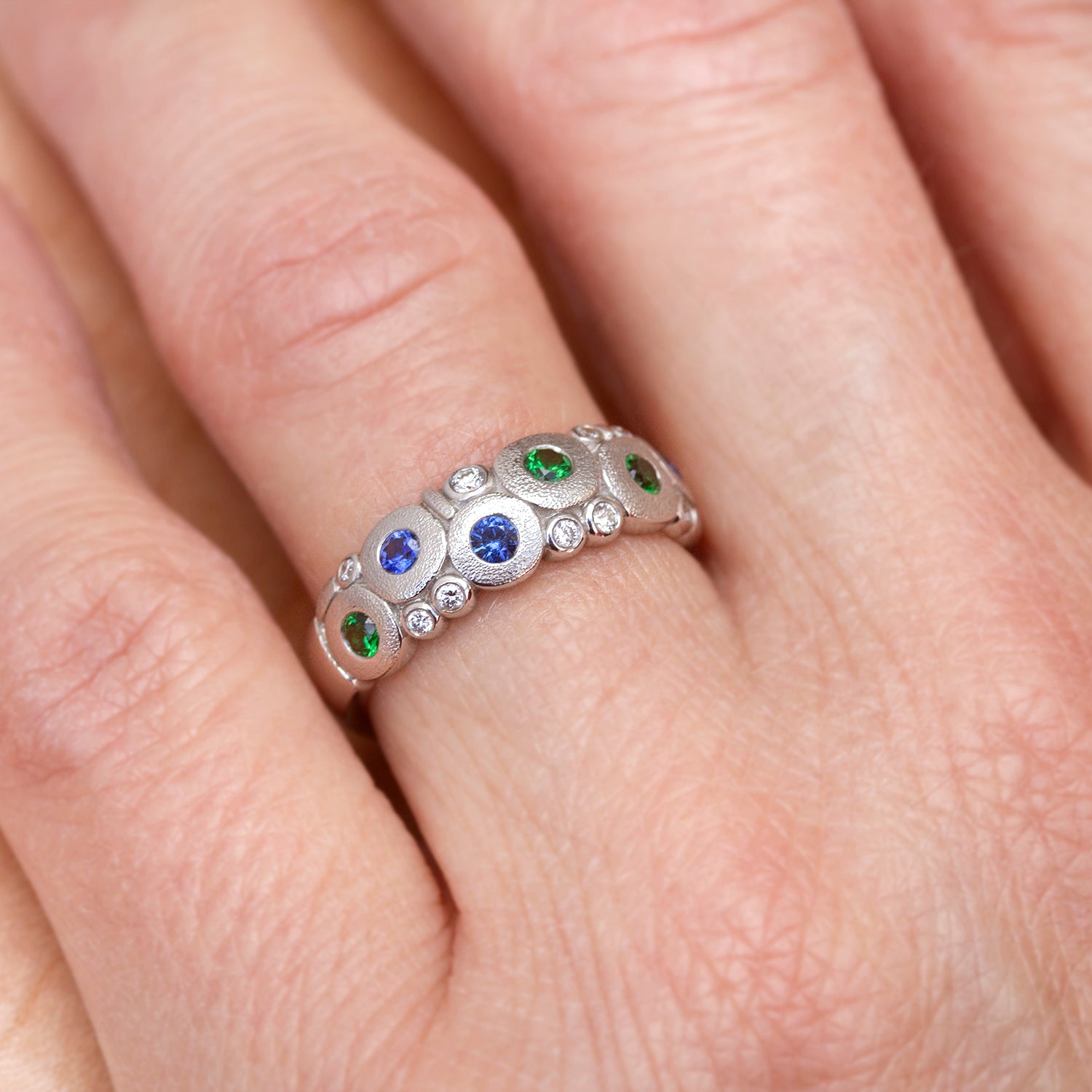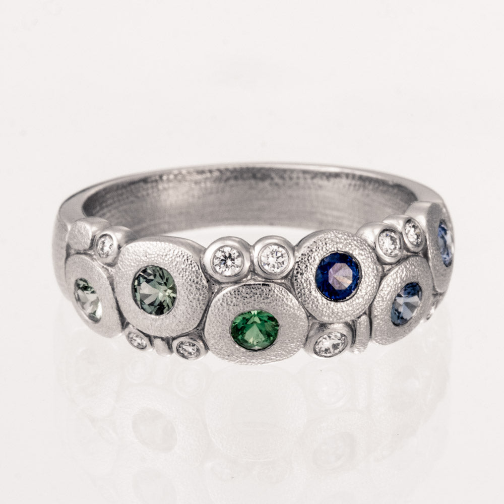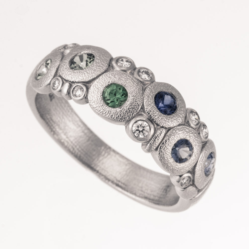 Candy Ring in Antiqued Platinum - Blue-Green Fade - Sapphires and Tsavorites with White Diamonds - Slightly Domed Band tapering at the back with round hammered shapes across the top - 6 colored gemstones with a total carat weight of 0.50ct include 1 Tsavorite, 2 green sapphires and 3 blue sapphires bezel set and arranged in a color fade - 9 round bezel set white diamonds with a total carat weight of 0.10ct - All white diamonds have a color grade of F-G and clarity of VVS - Hand Hammered and Textured - Oxidized - This ring measures 6.5mm tall at the top by 2mm deep and tapers to 3.5mm wide by 1mm deep at the back.