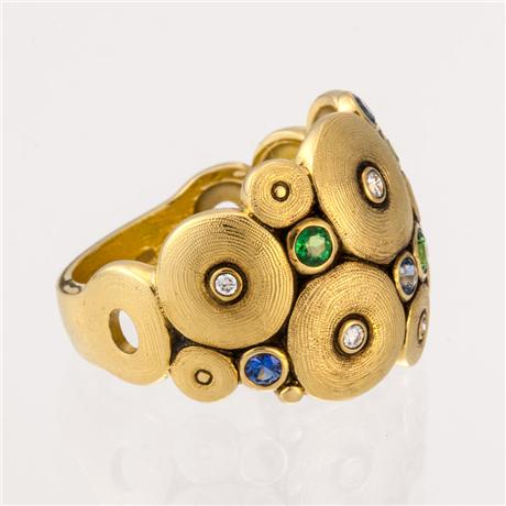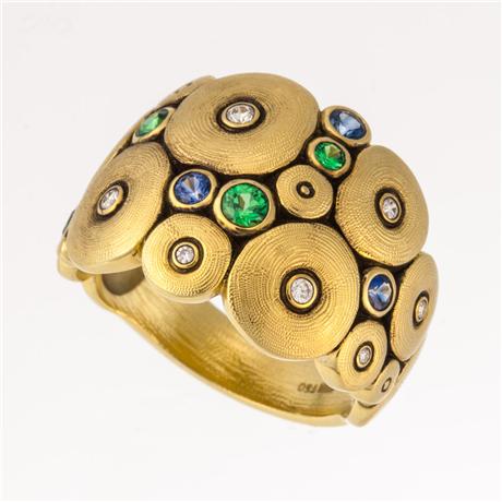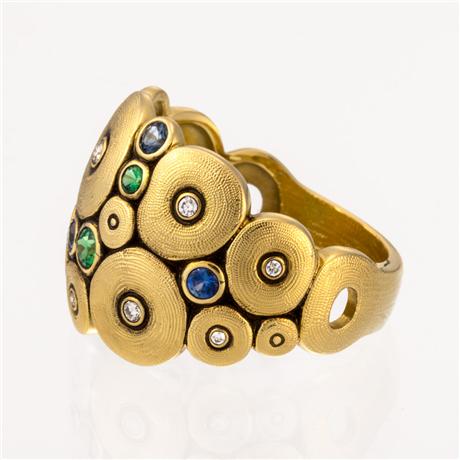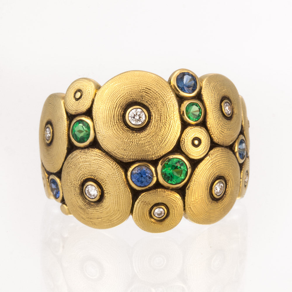 Regular price $10,115.00 Save $-10,115.00An Orchard of organic shapes and textures… that’s just ripe for the picking. Non-symmetrical, unpredictable shapes and symbols that are precisely created to coexist with one another, Alex Šepkus conceives most of his designs without sketching them first. He carves, engraves and hammers until the design is complete. In his native country of Lithuania, the schools of art are quite like the medical schools here; you have to be proficient in all aspects, not just one. You will see his sculptural talent and his strong understanding and respect for precision and balance personified by his father, a well-respected architect, in this band. 18k oxidized yellow gold with round white diamonds, green tsavorites and blue sapphires. Gemstone colors will vary slightly in each ring.