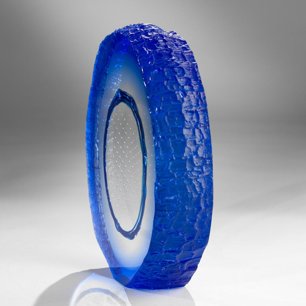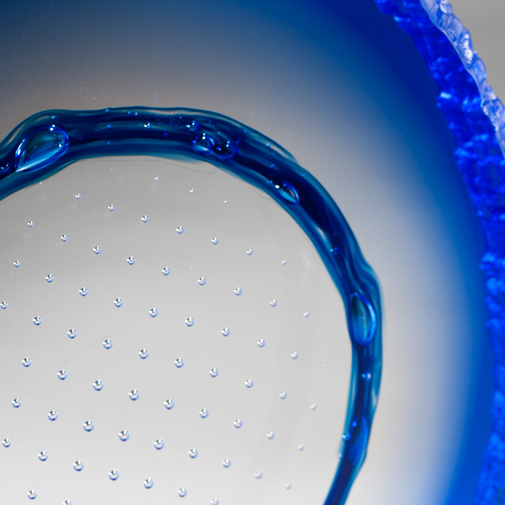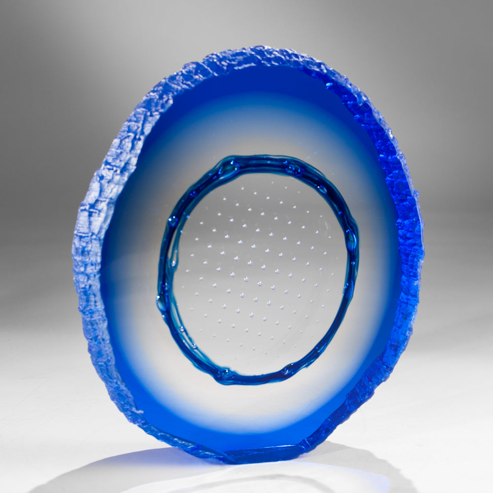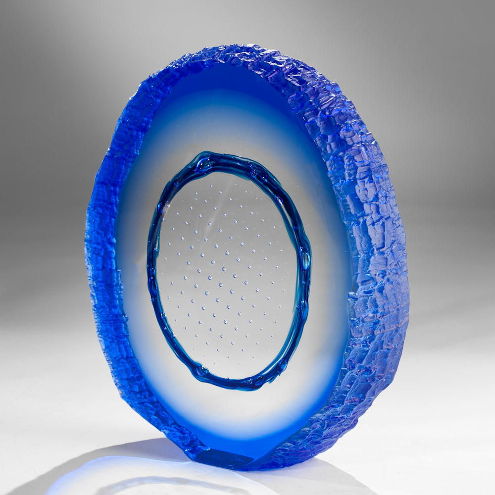 Regular price $1,395.00 Save $-1,395.00Gentle MIST. Ever calming and peaceful. There are many natural elements to this contemporary glass sculpture. In the center you will find a grid of tiny floating bubbles. The small bubbles are encircled by a ring of blue that contains larger, more sporadic bubbles. The darker, outside edges have the look and feel of frozen tree bark with a soft satin finish. The blue edge gradates, creating magnificent depth and glow. The front and back are cut flat and polished. This hand blown, cut and polished glass was created in the Czech Republic by Pavel Havelka.