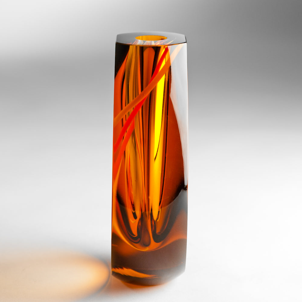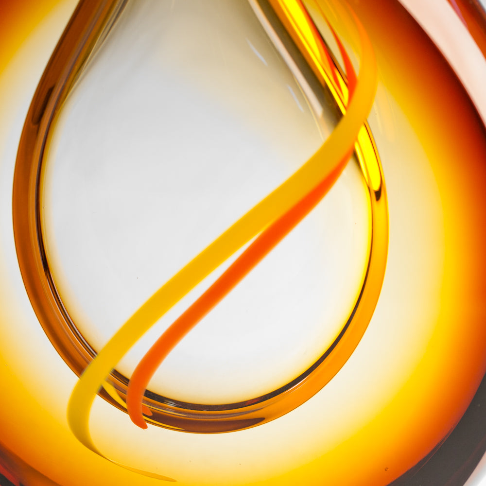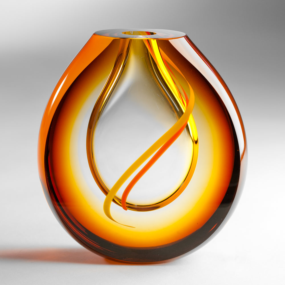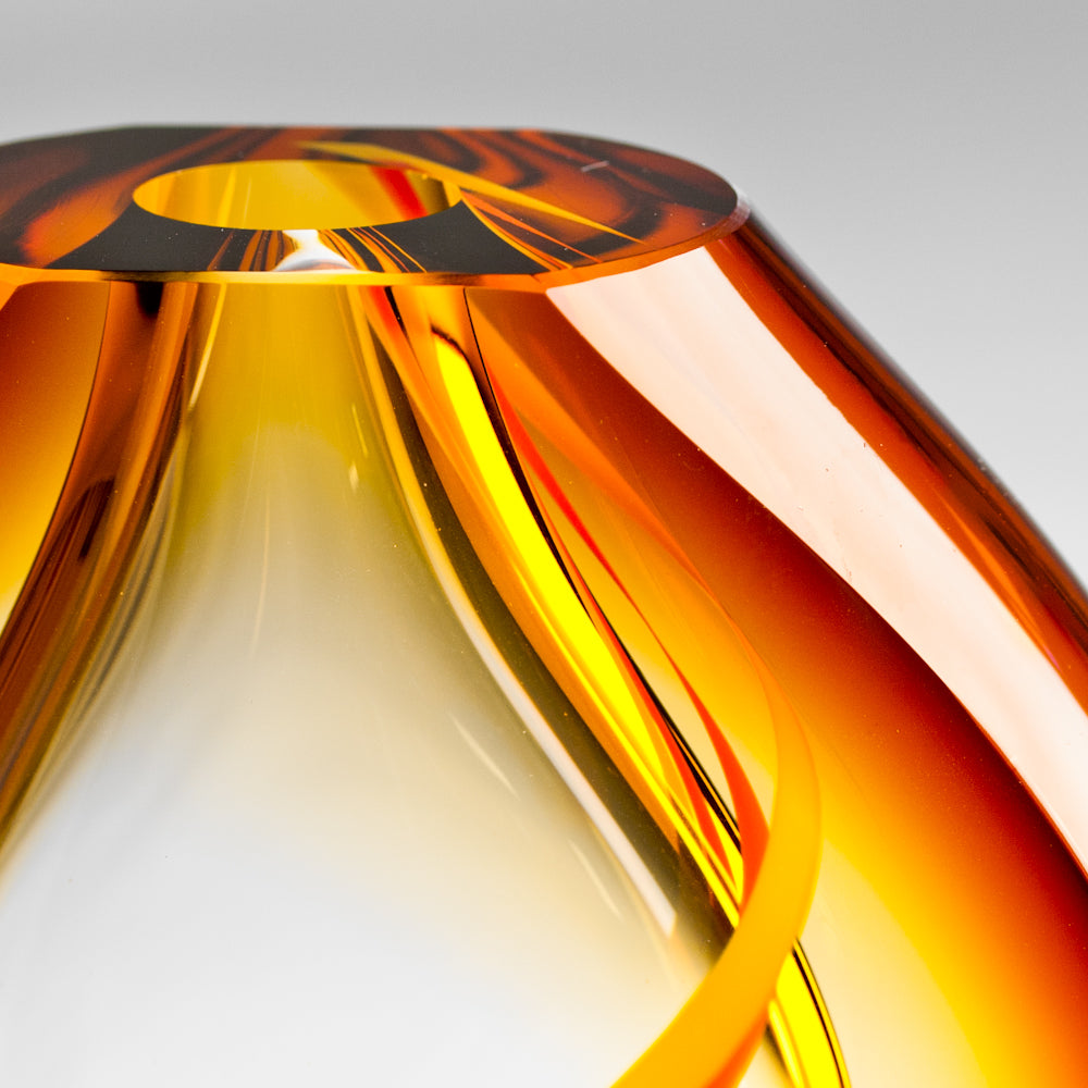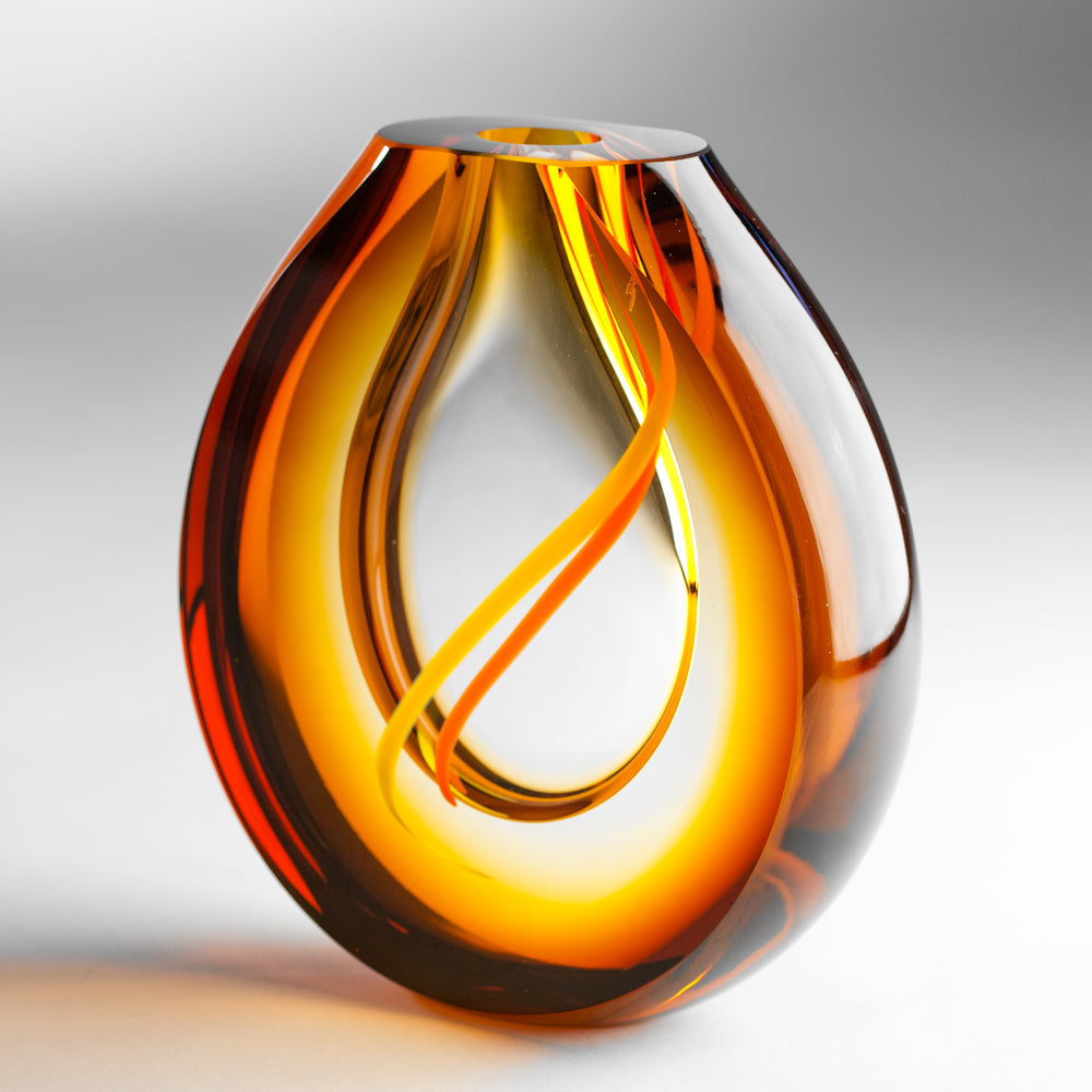 Intriguingly RIBBONesque. This contemporary art glass vase contains a fusion of ethereal amber colored glass that creates a soft, warm golden glow. The small open circle at the top directs the eyes to an open teardrop shape that is encircled by two amber colored glass ribbons dancing in perfect synchronicity. Hand-blown, polished and cut. The sides are softly curved with the front, back and top perfectly flat. Created and signed by Czech glass artist Pavel Havelka.