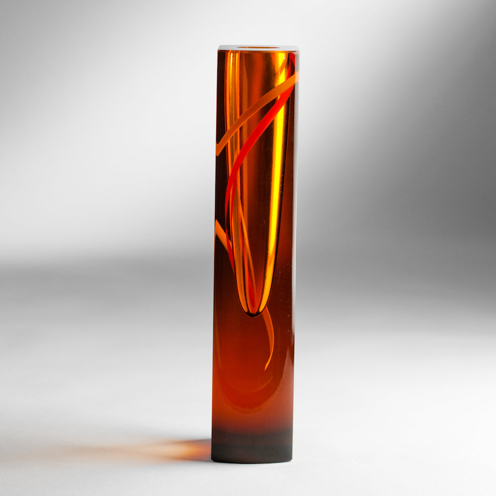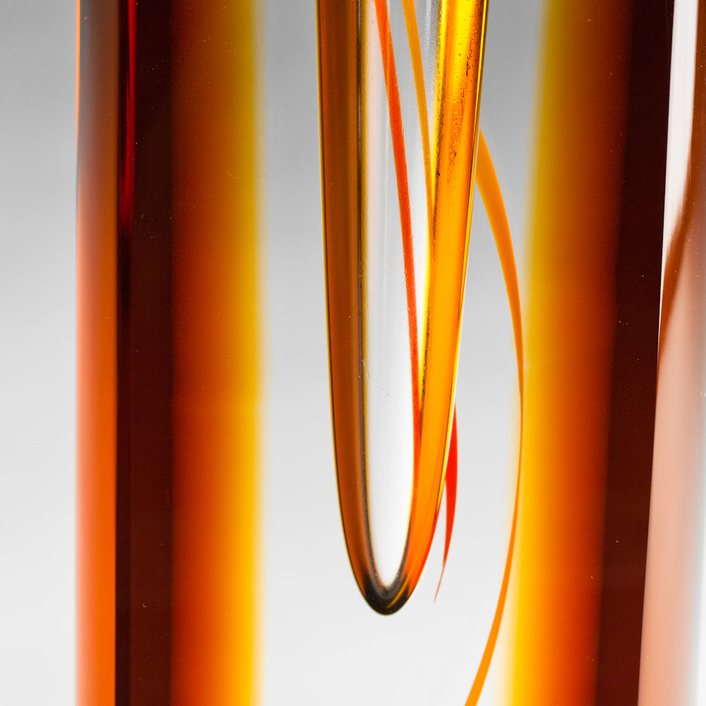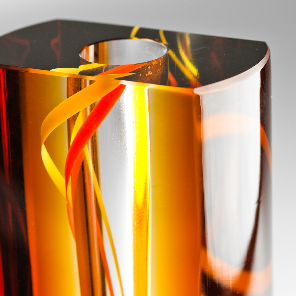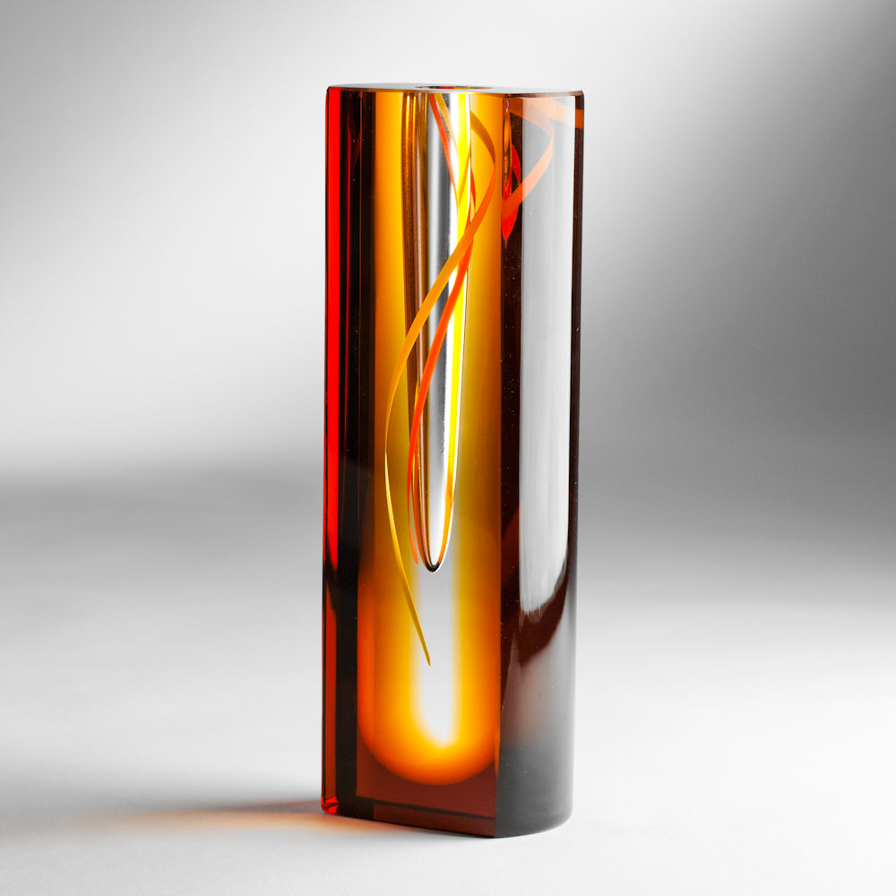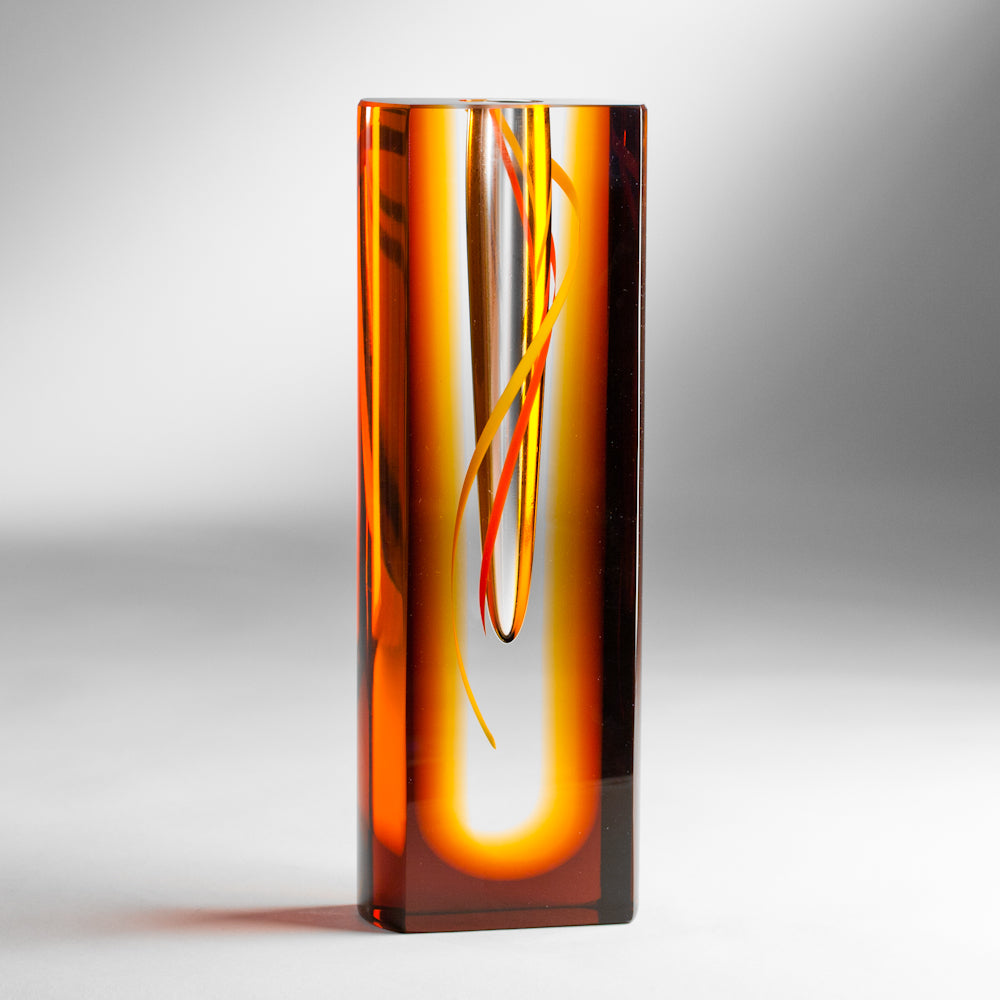 Pavel Havelka for Princ Glass Art - Tall rectangular shaped vase, cut on two sides, amber with one orange and one yellow ribbon at the center, 26cm tall by 9cm wide by 5cm deep.