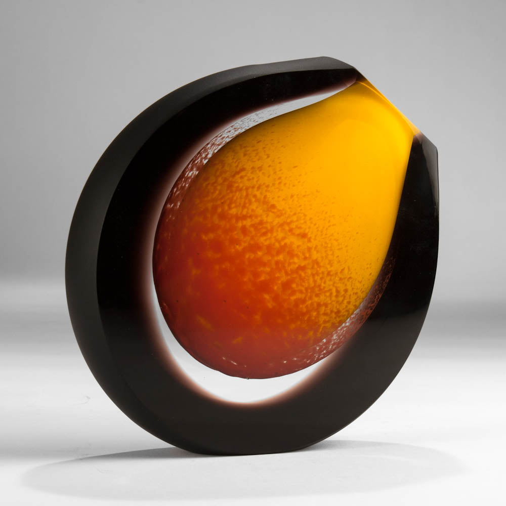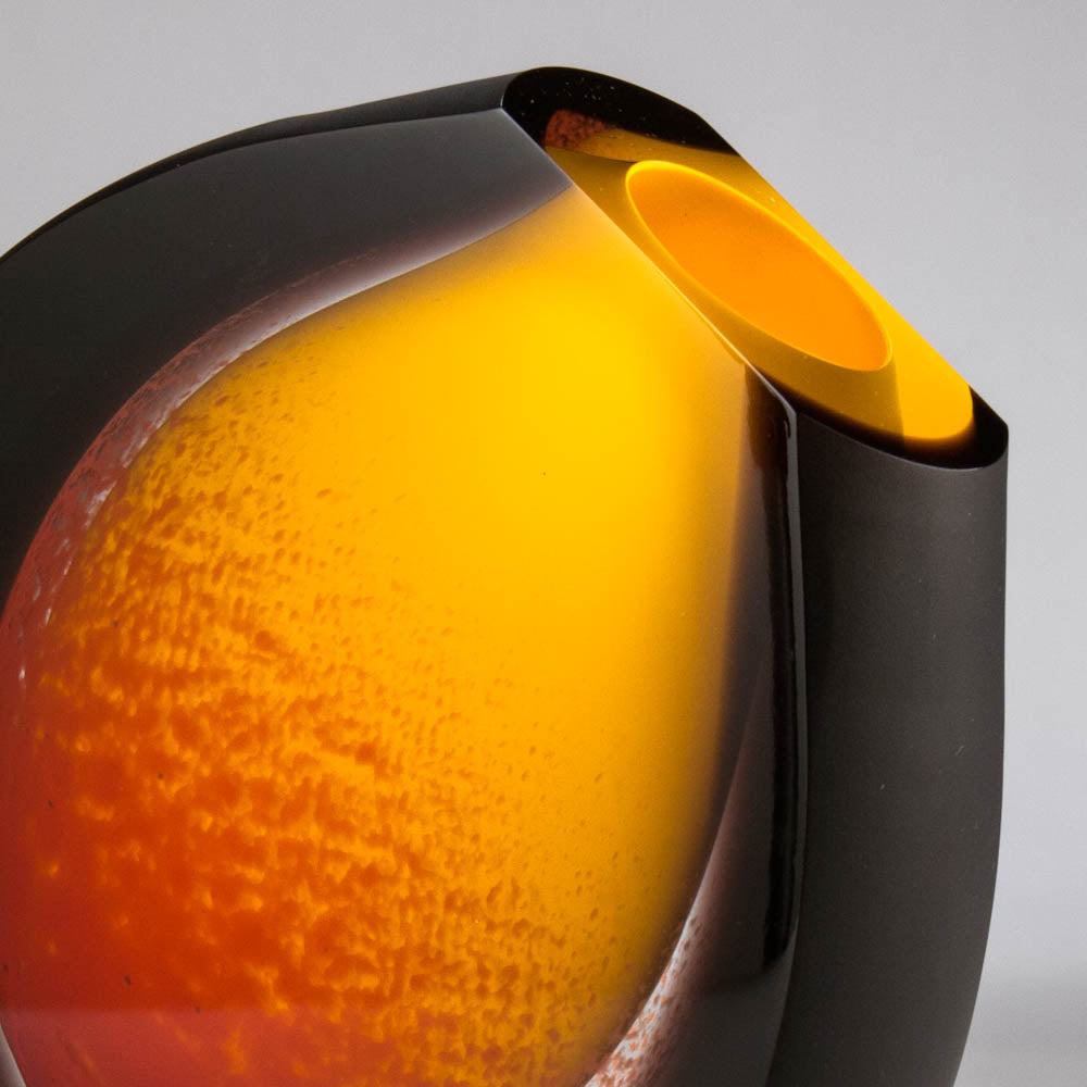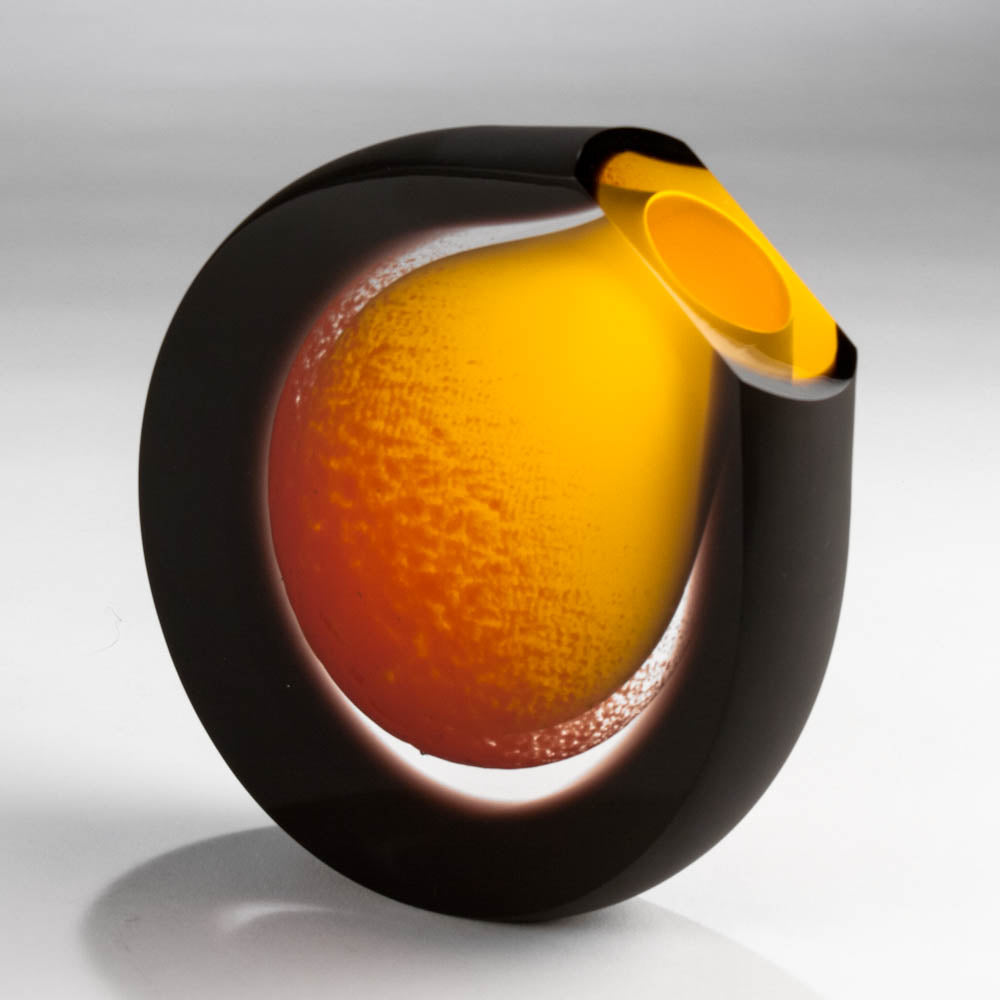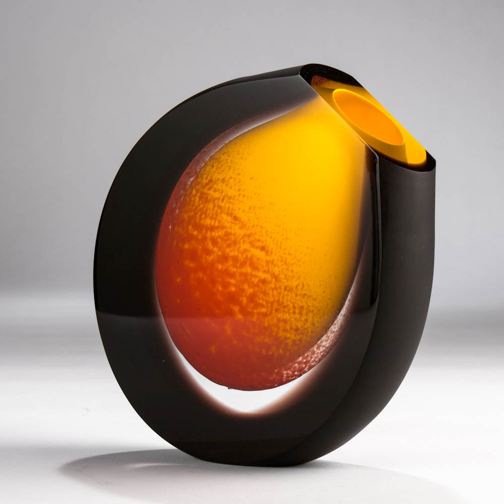 Round vase set on an angle, satin sides in black with opaque dark amber yellow center accented with red - Available in two sizes - Small: 16cm tall by 17cm wide by 3cm deep - Large: 22cm tall x 23cm wide x 6cm deep.