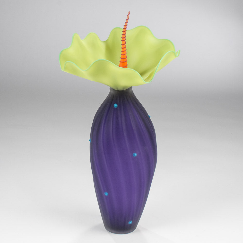Regular price $420.00 Save $-420.00BOBtanical TALL BOB in Amethyst with Turquoise Dots, an Opaque Olive Ruffle with Opaque Olive Rim and a Stamen Stopper in Tangerine with a thin Opaque Rose Spiral - From the BOBtanical Collection - Urn shaped body with small dots of color topped with a floral inspired ruffle and corked with a stamen shaped top with rubber stopper. Each vessel is mouth blown out of Soda-Lime Furnace Glass (Crystalo Glass). It is then Acid Etched.