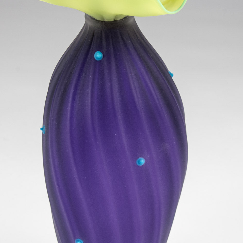 This amethyst BobTanical vessel has amethyst purple urn shaped body with turquoise dots. Opaque olive ruffle with olive rim. Stopper is mango with purple spiral. Mouth blown and frosted.