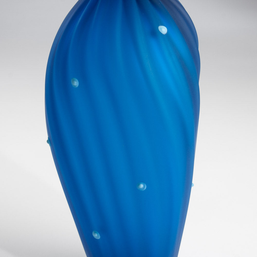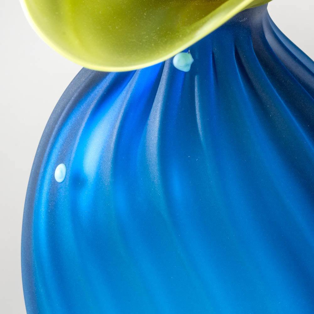 Regular price $420.00 Save $-420.00BOBtanical TALL BOB in Aqua with Light Blue Dots, an Olive Ruffle with Olive Rim and a Stamen Stopper in Mango with a thin Mango Spiral - From the BOBtanical Collection - Urn shaped body with small dots of color topped with a floral inspired ruffle and corked with a stamen shaped top with rubber stopper. Each vessel is mouth blown out of Soda-Lime Furnace Glass (Crystalo Glass). It is then Acid Etched.